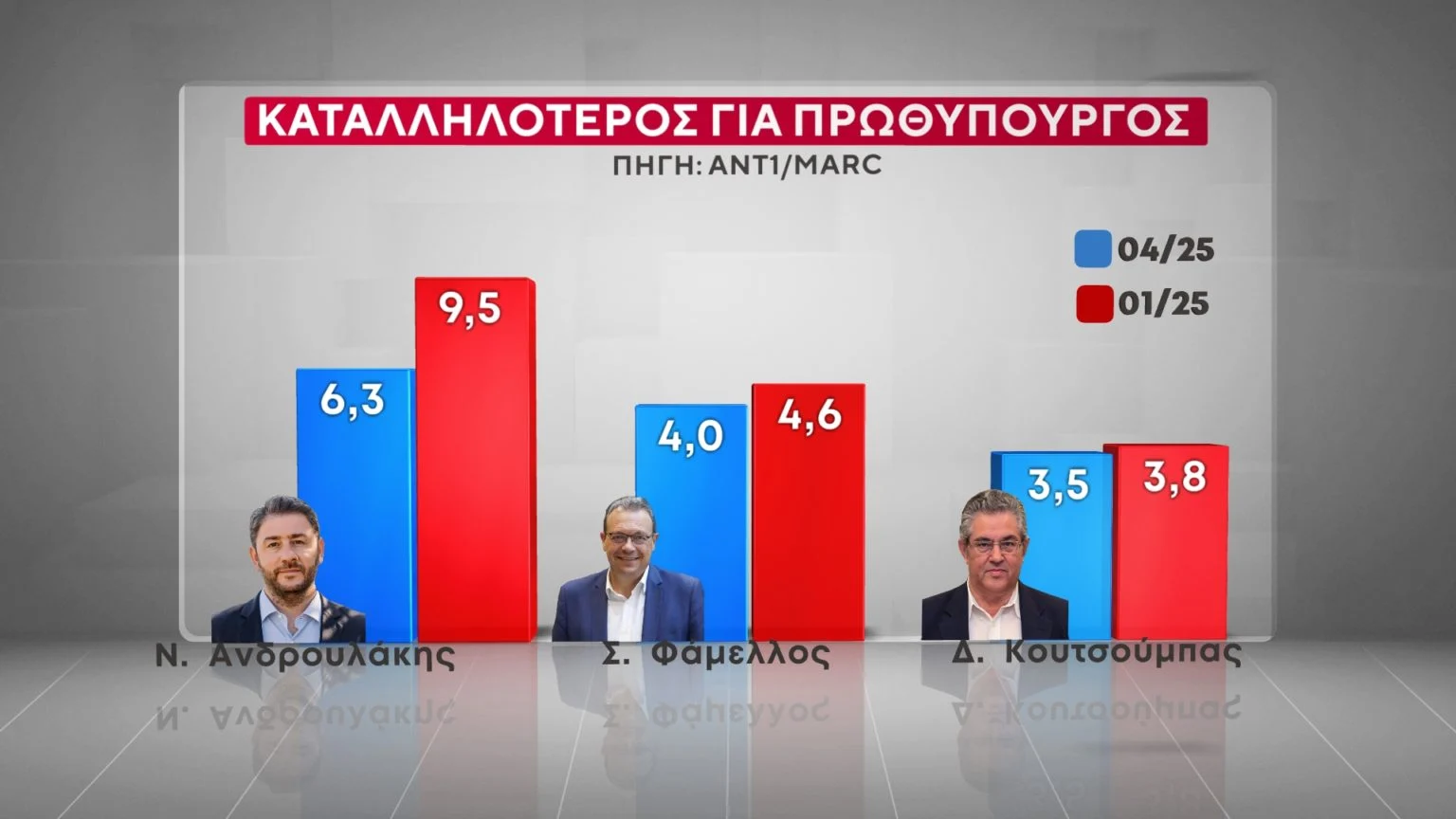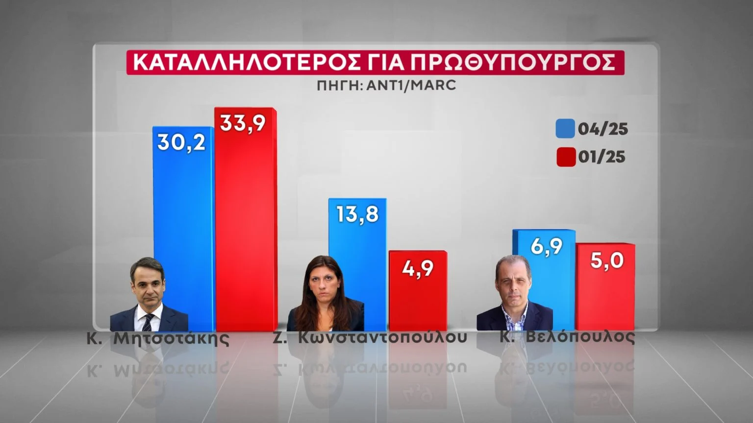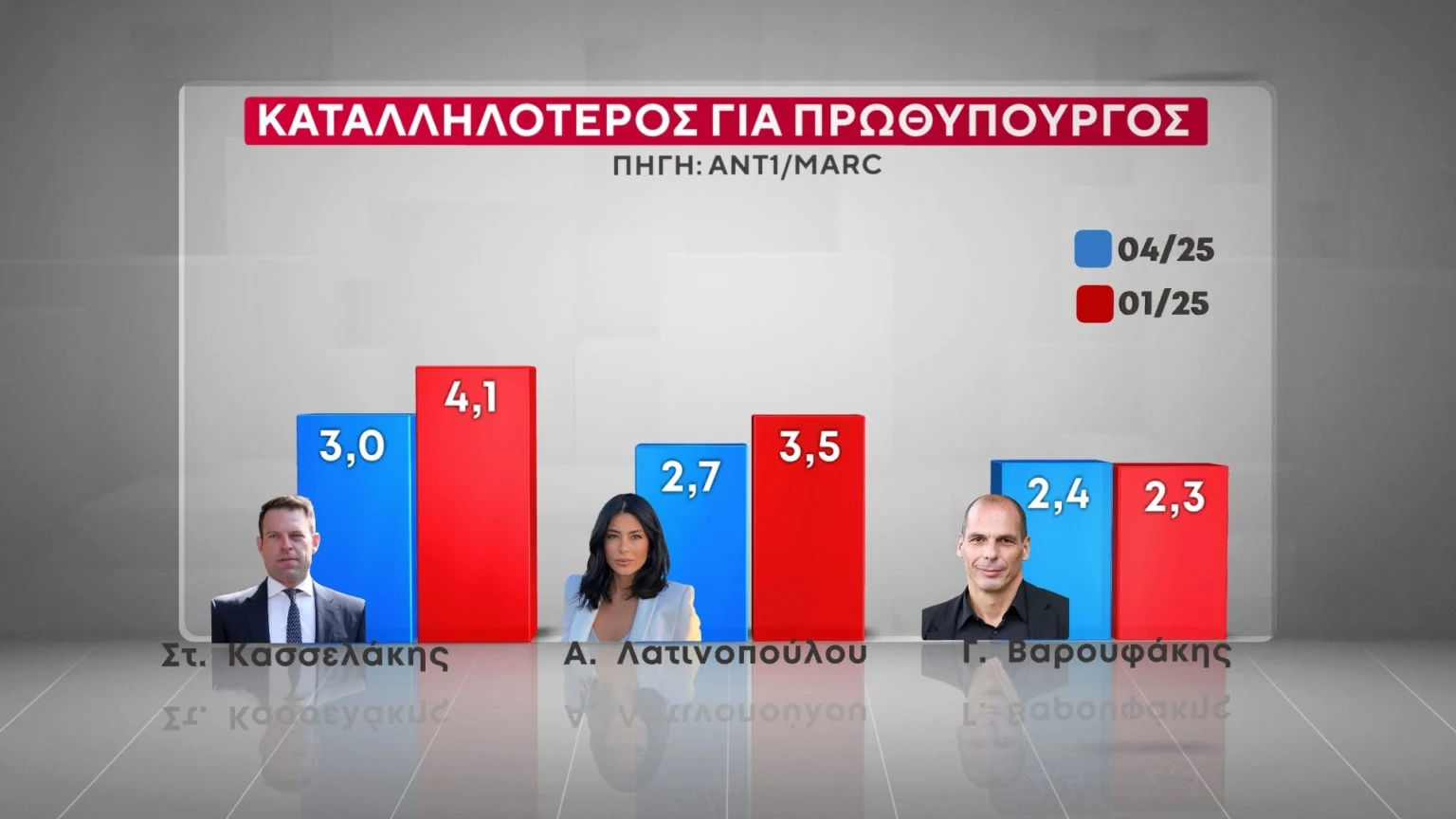 Στην ερώτηση «Ποιος είναι καταλληλότερος για Πρωθυπουργός», πρώτος στη δημοσκόπηση είναι ο Κυριάκος Μητσοτάκης με ποσοστό 30,2% μειωμένο από τον Ιανουάριο που στην ίδια ερώτηση είχε απαντήσει τον Κυριάκο Μητσοτάκη το 33,9%. Σημαντική αύξηση είχε η Ζωή Κωνσταντοπούλου ως καταλληλότερη για Πρωθυπουργός αφού το ποσοστό που συγκέντρωνε τον Ιανουάριο ήταν 4,9% και τώρα βρίσκεται στο 13,8%. Ο Κυριάκος Βελόπουλος συγκέντρωσε το 6,9% και πέρασε τον Νίκο Ανδρουλάκη που έχει ποσοστό 6,3%. Ακολουθούν ο Σωκράτης Φάμελλος με ποσοστό 4% και ο Δημήτρης Κουτσούμπας με 3,5%.