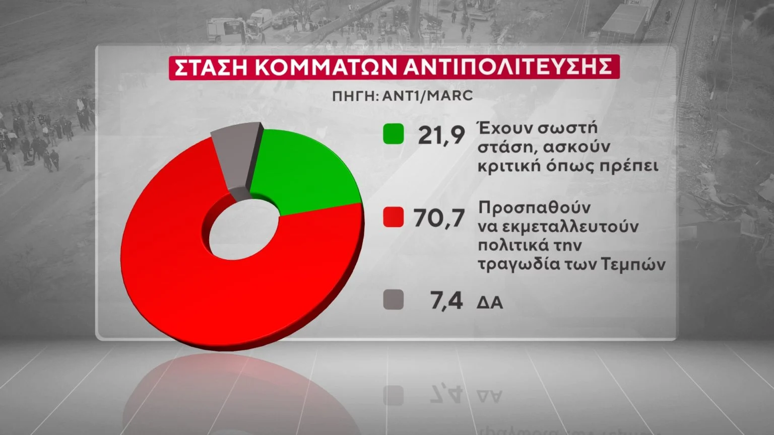 Την ίδια ώρα, το 70,7% των ερωτηθέντων θεωρεί ότι τα κόμματα της αντιπολίτευσης προσπαθούν να εκμεταλλευτούν πολιτικά την τραγωδία των Τεμπών, ενώ το 21,9% εκτιμά πως έχουν σωστή στάση και ασκούν κριτική όπως πρέπει.