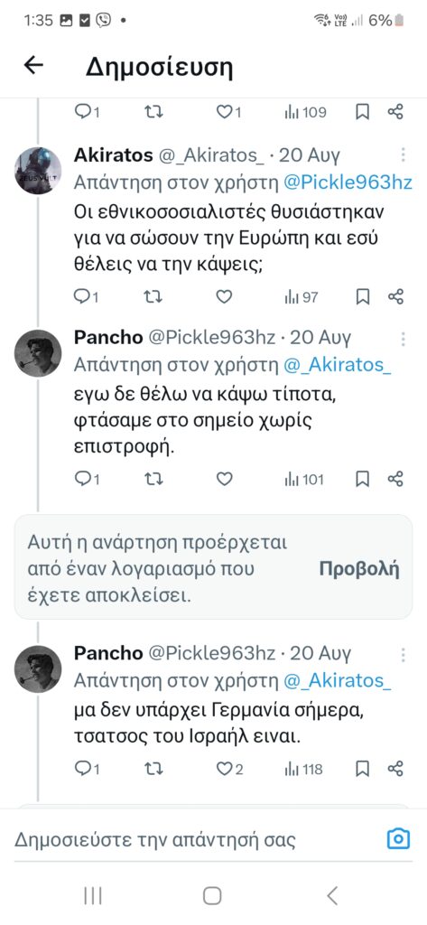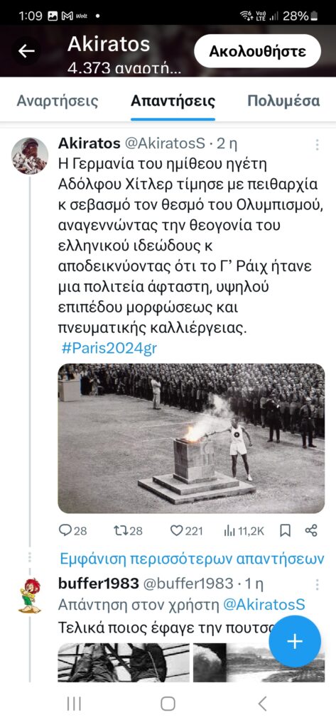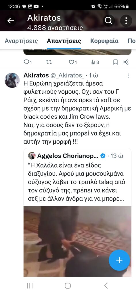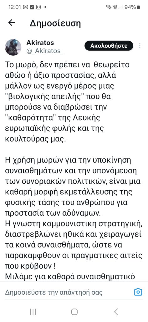Ο αστερισμός αυτών των λογαριασμών είναι ιδιαίτερα ευρύς. Ωστόσο, εδώ, για λόγους οικονομίας, θα αναφέρουμε μόνο τρεις από αυτούς, οι οποίοι, επαναλαμβάνουμε, αποτελούν πολύ μικρό τμήμα ενός πιο πολυπληθούς σχήματος. Ο ένας εξ αυτών των λογαριασμών, ο οποίος δηλώνει ξεκάθαρα νεοναζιστής επιχειρεί στο πρώην twitter και εμφανίζεται με το όνομα Ακήρατος (@Akiratos_XI).