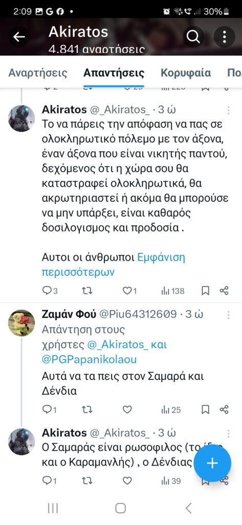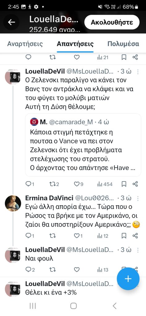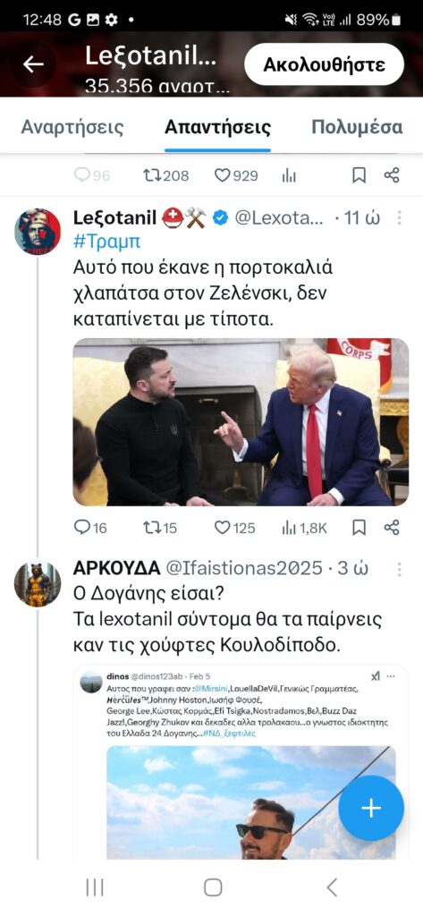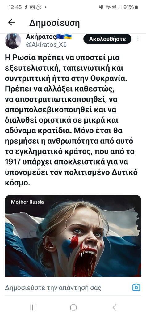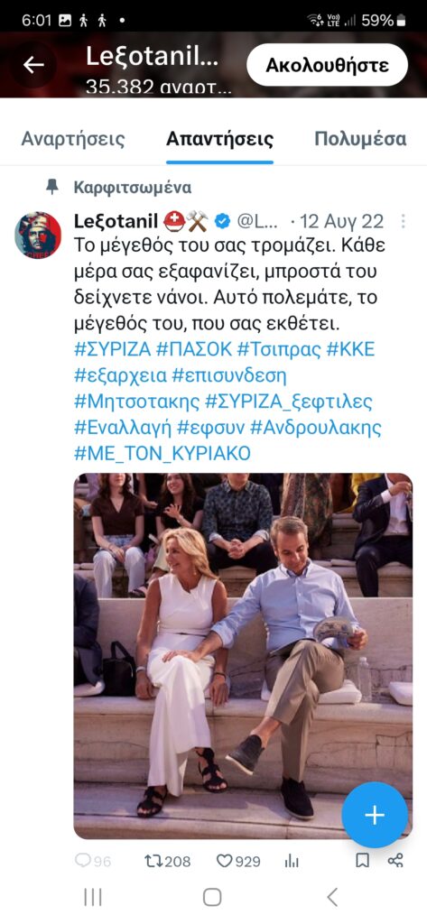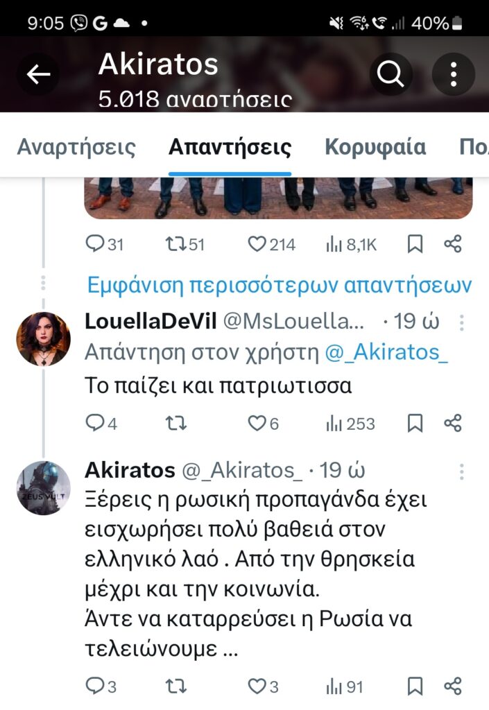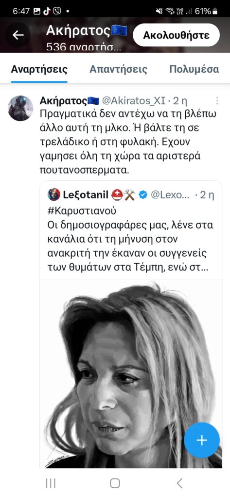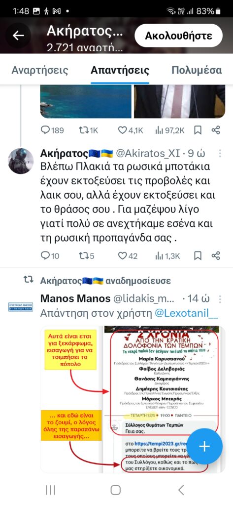 Τις αναρτήσεις του Ακήρατου αναπαράγουν μαζικά και συστηματικά οι Lexotanil και LuellaDeVill, οι οποίες προσθέτουν τις δικές τους πινελιές ενάντια στη Ρωσία, τις ΗΠΑ και τους διαδηλωτές για τα Τέμπη, συμπεριλαμβανομένων των συγγενών των θυμάτων. Αυτά λοιπόν για προβληματισμό για τον κ. Μητσοτάκη, μιας που δήλωσε ότι θεωρεί σημαντικό το τι συμβαίνει στα social media.