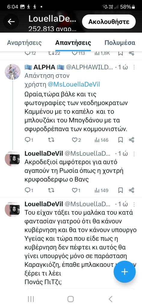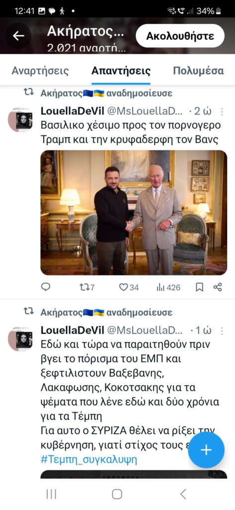 Οι άλλοι δύο είναι οι εμβληματικοί φιλοκυβερνητικοί λογαριασμοί στο twitter Lexotanil και LouellaDeVill, διαβόητοι για τον τοξικό τους λόγο έναντι όσων θεωρούν ότι θίγουν τον πρωθυπουργό και ιδιαίτερα έναντι της κας Καρυστιανού και των άλλων που πρωτοστατούν, ή απλά συμμετέχουν στις διαμαρτυρίες για τη συγκάλυψη που επιχειρείται για την τραγωδία των Τεμπών.