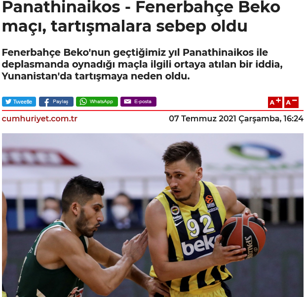 Η “Τζουμχουριέτ” μεταφέρει το ρεπορτάζ ως διαμάχη αντιπολίτευσης και κυβέρνησης αναφέροντας ότι δημιουργήθηκε θέμα με το εκτός έδρας παιχνίδι της Fenerbahçe με τον Παναθηναϊκό και ότι σύμφωνα με την “Efimerida ton Sintakton” «τέσσερα μέλη της αποστολής όταν η πτήση προσγειώθηκε στο αεροδρόμιο της Αθήνας είχαν υψηλό πυρετό πριν από τον αγώνα που διεξήχθη στις 22 Οκτωβρίου 2020. Παρ ‘όλα αυτά, οι ελληνικές πολιτικές αρχές επέτρεψαν να εισέλθουν όλοι στη χώρα ως αποτέλεσμα τηλεφωνικών εντολών». Η “Τζουμχουριέτ” εν συνεχεία αναφέρεται στην «σκληρή απάντηση» που έδωσε ο υφυπουργός Νίκος Χαρδαλιάς, που ανακοίνωσε ότι είχε καταθέσει αγωγή εναντίον της. Η τουρκική εφημερίδα παραθέτει τι είπε ο κ. Χαρδαλιάς: