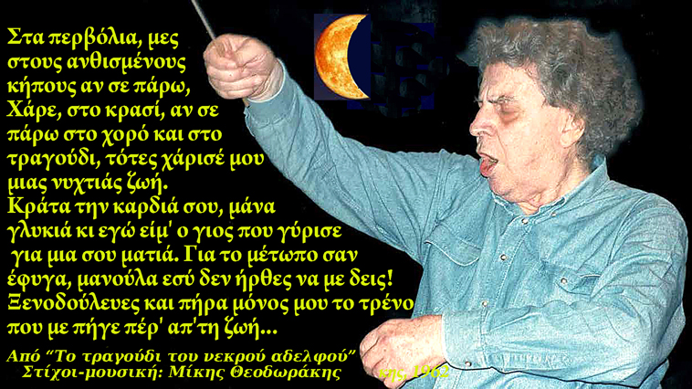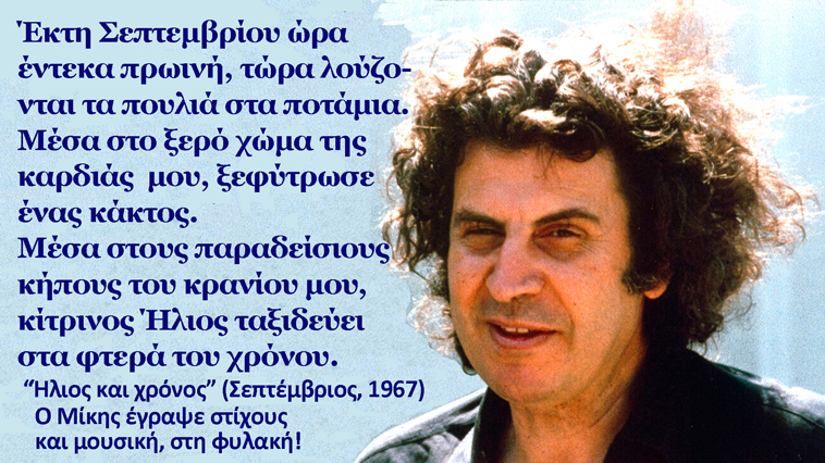 Ίσως εκπλαγείτε, μερικοί, όταν διαβάσετε ότι τοποθετώ τον Μίκη, πιο ψηλά από τους ονομαζόμενους “κορυφαίους και πασίγνωστους κλασικούς μουσικούς δημιουργούς”! Ο Μίκης δεν έχει (πια…) επίθετο, ακριβώς όπως δεν έχει επίθετο ο Δίας, ο Βούδας, ο Αλλάχ, ο Θεός… Το κείμενο αυτό δεν το “στρογγύλεψα” με υποκριτικούς καλλωπισμούς, ούτε έκανα “α-λογοκρισία”, γιατί τότε θα θόλωναν τα χειροπιαστά δεδομένα! (Αν έχετε αμφιβολίες, ελέγξτε (please…) “όλες” τις “παρατηρήσεις” και τους “ισχυρισμούς” μου!) Ένας 65-ρης Χαράλαμπος, “σουρταφέρτας”, καραγωγεύς δι’ ωθήσεως, είχε πει σ’ ένα ταβερνάκι (Θεσσαλονίκη, Καμάρα): «Τα χαστούκια της αλήθειας, πονάνε, ακόμα κι αν δεν πέφτουνε επίτηδες…»).