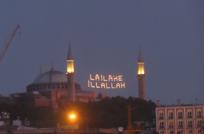 Και πως “κρύβουν” αφώτιστο τον “παμμέγιστο και θεότατο”, το “πάσης της γης αγαλλίασμα”, Ναό της Σοφίας του Θεού. Πρέπει να γνωρίζει κανείς σε ποιο σημείο της Πόλης βρίσκεται για να τον διακρίνει από το λιγοστό φως στους μιναρέδες και από μια φωτεινή επιγραφή “με νόημα” στα τουρκικά.