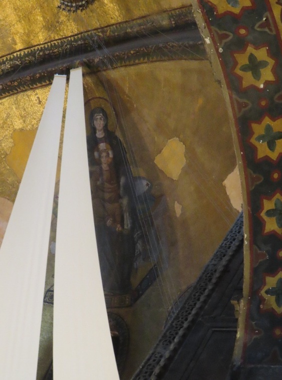 Η πρώτη όμως μεγάλη “ανταμοιβή” ως πνευματικό γεγονός και εσωτερίκευσης μας ήρθε όταν, σχεδόν στο ίδιο ύψος που βρισκόμασταν στον γυναικωνίτη, είδαμε κρυμμένη, πίσω από άσπρες κουρτίνες, την ψηφιδωτή εικόνα της “Πλατυτέρας των Ουρανών”. Η Ένθρονη Θεοτόκος με το Θείο Βρέφος στα γόνατά της, τοποθετημένη στην κεντρική κόγχη της αψίδας του Ιερού Βήματος, δορυφορούμενη από δύο αγγέλους, που με δυσκολία μπορούσα να διακρίνω.