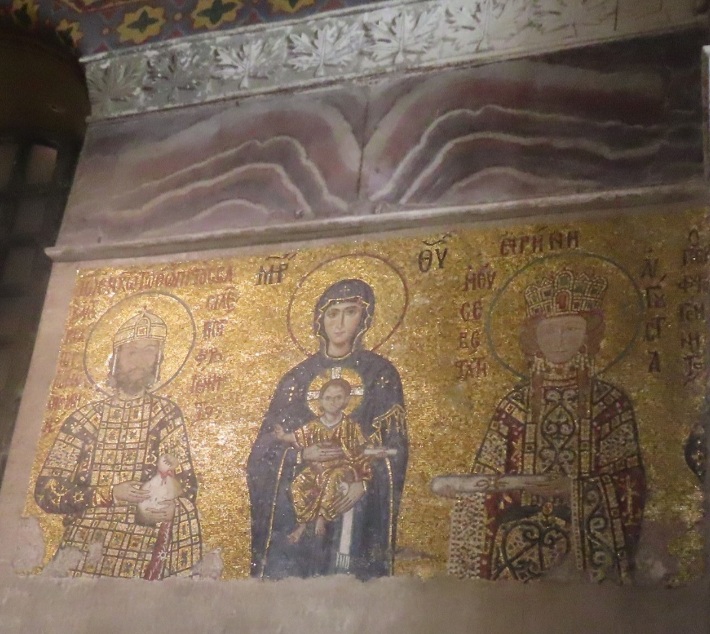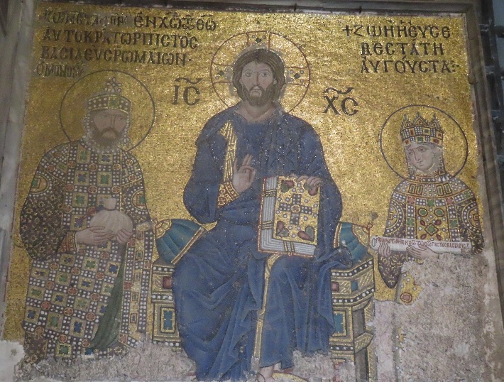 Προχωρούσα με ανάμικτα συναισθήματα αγανάκτησης και απογοήτευσης για τον τρόπο που οι Τούρκοι αντιμετωπίζουν τέτοιες “ιερές καταστάσεις”, ακόμα και σε επίπεδο υψηλής τέχνης. Βαδίζαμε σχετικά γρήγορα, σαν να βιαζόμασταν να φύγουμε από ένα ιερό τόπο, που γνωρίζαμε ότι κάποτε βεβηλώθηκε και πως εξακολουθεί και σήμερα κατά κάποιο τρόπο να βεβηλώνεται. Λίγο δεξιότερα της “Πλατυτέρας”, κρυμμένοι πίσω από μουσουλμανικές επιγραφές με τα ονόματα του Αλλάχ, του Μωάμεθ και των τεσσάρων πρώτων Χαλίφηδων, ήταν το εξαιρετικής ομορφιάς ψηφιδωτό, που απεικόνιζε τον αυτοκράτορα Κωνσταντίνο Θ΄ τον Μονομάχο και την “ευσεβεστάτη” Αυγούστα Ζωή, δίπλα στον ευλογούντα Ένθρονο Ιησού.