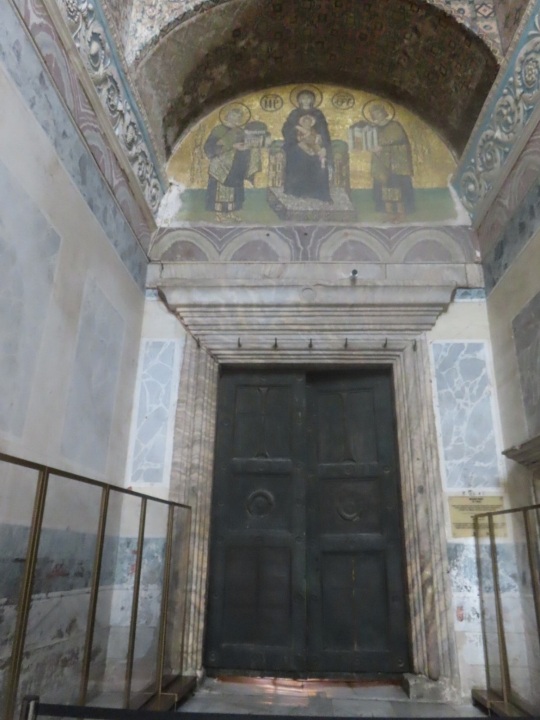Δεν θα είχαν περάσει ούτε δύο ώρες, όταν φτάσαμε, χωρίς καλά-καλά να το αντιληφθώ, στην έξοδο του ναού. Το τελευταίο ψηφιδωτό αριστούργημα που ξεχώριζε ήταν τοποθετημένο στην κόγχη, πάνω από τη μεγαλοπρεπή “Ωραία Πύλη” του Εσωνάρθηκα. Επρόκειτο για την ψηφιδωτή εικόνα της Ένθρονης Παναγίας με τον Χριστό στην αγκαλιά της και από δίπλα δύο σπουδαίους αυτοκράτορες. Στα αριστερά τον Άγιο Μέγα Κωνσταντίνο να της προσφέρει την Πόλη και στα δεξιά τον Ιουστινιανό να της προσφέρει τον ναό της Αγίας Σοφίας.