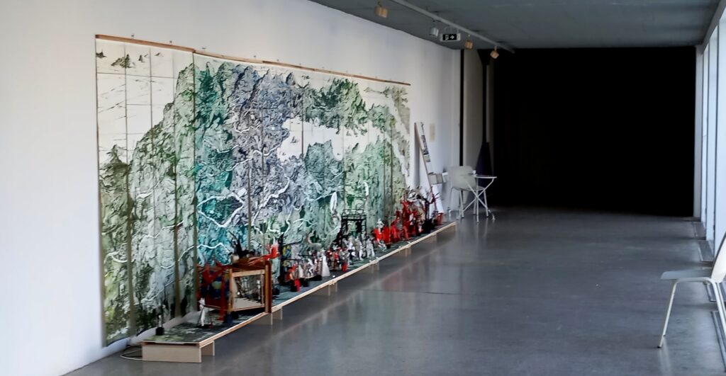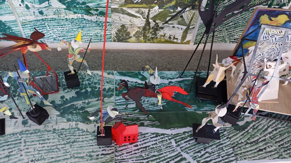 Τα φανταστικά αυτά τοπία απλώνονται σε μήκος σχεδόν 10 μέτρων παράλληλα με τη χαμηλή βάση, πάνω στην οποία διαδραματίζονται μικρές και μεγάλες ιστορίες με ιππότες, αρλεκίνους, πυργοδέσποινες, μασκοφόρους κι άλλες φιγούρες -σκιές του θεάτρου που όμως απηχούν τόσο τρυφερά, όσο και διαχρονικά την διαρκώς φεύγουσα πραγματικότητα.