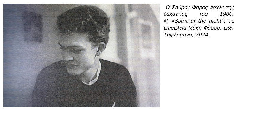 Ο Σπύρος Φάρος, γεννήθηκε χειμώνα του 1964 και έφυγε απ’ τη ζωή άνοιξη του 2022. Πήγε σχολείο στον Βύρωνα και οι πρώτες του παρέες ήταν από εκεί. Έγινε γνωστός αρχικά ως μπασίστας, ενώ αργότερα πέρασε και στην κιθάρα. Υπήρξε εξαιρετικός μουσικός και συνθέτης, είτε συμμετέχοντας σε διάφορα συγκροτήματα είτε ακολουθώντας πιο προσωπικά μονοπάτια. Ίσως μάλιστα να αποτελεί την πρώτη περίπτωση μουσικού-από όσους ξεκινήσανε από τα συνοικιακά γκρουπάκια των έιτιζ-που ξεφεύγει από τα όρια ενός είδους, όπως και να ονομάζεται, punk, new wave, darkwave, post punk κλπ και απλώνεται σε διαφορετικές κατευθύνσεις, τις οποίες υπηρετεί με την ίδια αγωνία και ποιότητα.