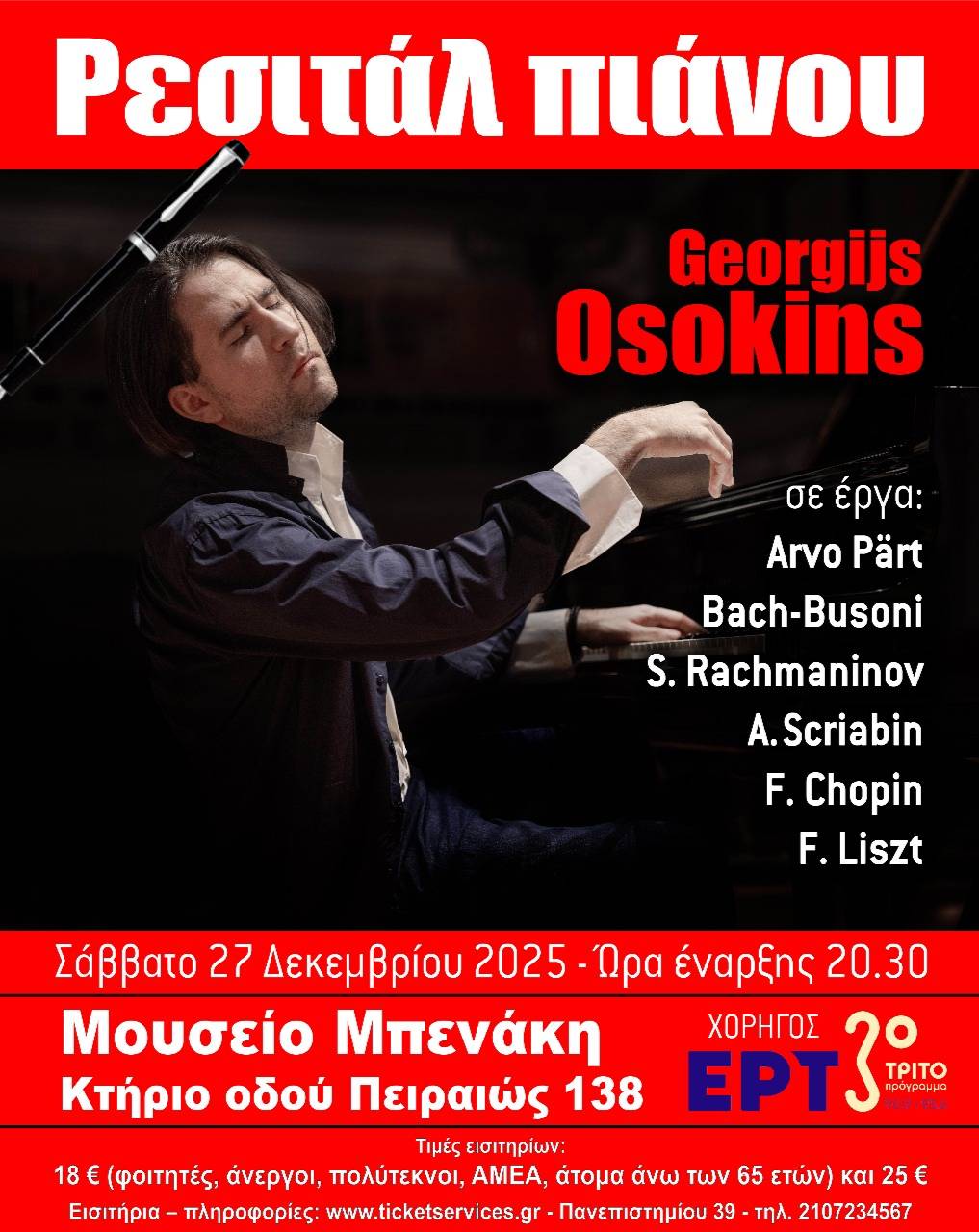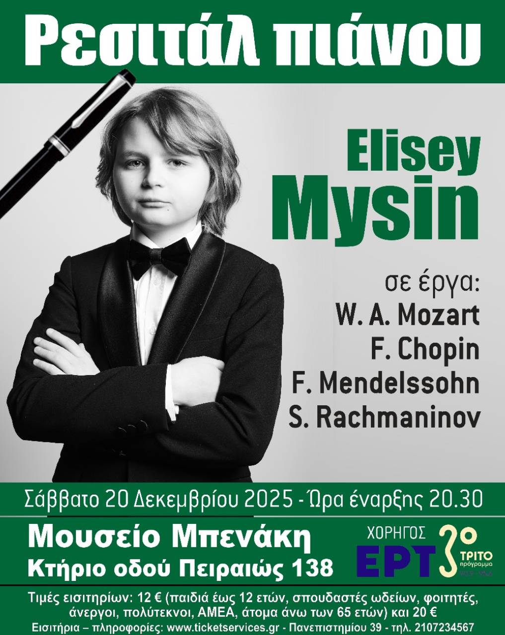 Το πιανιστικό φεστιβάλ οργάνωσε το Artistic Office “Musseo” του συνθέτη Γιώργου Πλουμπίδη. Το πρόγραμμα του ρεσιτάλ πιάνου του Ελισέι Μίσιν στο Μουσείο Μπενάκη το Σάββατο 20 Δεκεμβρίου, περιλαμβάνει έργα Μότσαρτ, Σοπέν, Μέντελσον και Ραχμάνινοβ και οι τιμές των εισιτηρίων είναι 12 και 20 ευρώ. Το πρόγραμμα του ρεσιτάλ πιάνου του Γκεόργκις Οσόκινς το Σάββατο 27 Δεκεμβρίου, περιλαμβάνει έργα Περτ, Μπαχ, Ραχμάνινοβ, Σκριάμπιν, Σοπέν και Λιστ και οι τιμές των εισιτηρίων είναι 18 και 25 ευρώ. Εισιτήρια-πληροφορίες: www.ticketservices.gr