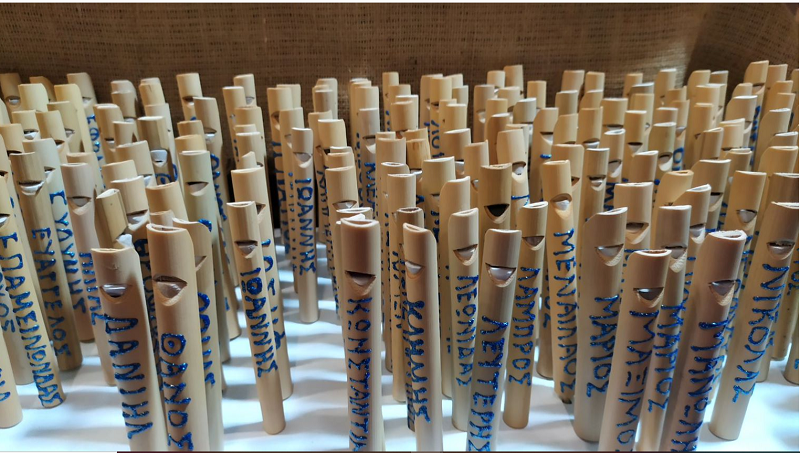 Απέναντι, ήχοι από παπιά, από πουλιά. Τους δημιουργούν οι χειροποίητες φλογέρες που πουλά μια μεσήλικη κυρία, που είχε την έμπνευση να γράφουν επάνω τους περισσότερα από 200 ελληνικά ονόματα γυναικεία και ανδρικά. Σταματούν πολλοί για να βρουν το όνομα τους και να την πάρουν. Ενδιαφέρον…