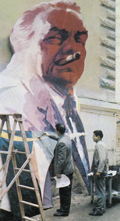 Εκείνος όμως που καλλιέργησε θαυμαστά το είδος της γιγαντοαφίσας στην Αθήνα υπήρξε αναμφίβολα ο σπουδαγμένος στη Σχολή Καλών Τεχνών, κυρίως αγιογράφος Στέφανος Αλμαλιώτης (1910-1987). Με την αξιομνημόνευτη ταχύτητά του στο σχέδιο και με εξαιρετικές ικανότητές του στο χρώμα, άφησε τη σφραγίδα του κατά το τέλος της δεκαετίας του 1930 στη λεγόμενη “Σχολή όπως Αθήνας”.