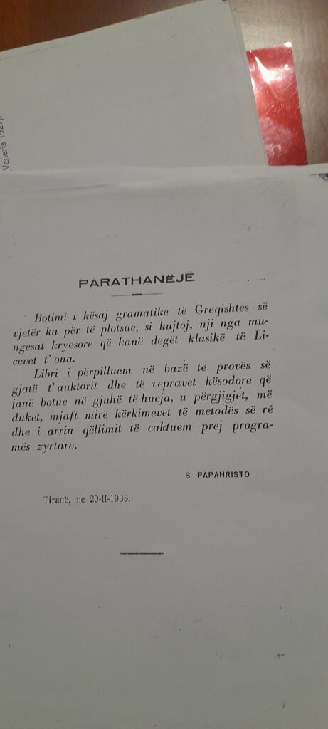 Όμως, καταδεικνύει και μια σχετική φροντίδα των αρμοδίων φορέων της Πολιτείας προς την κλασική παιδεία. Το εγχειρίδιο καταρτίστηκε για τις ανάγκες του Κολεγίου Θηλέων Τιράνων “Η Βασιλομήτορα” (ουσιαστικά πρόκειται για την Παιδαγωγική Ακαδημία Θηλέων που περιείχε και τμήμα Κλασικού Λυκείου – το Instituti Femnuer “Nana Mbretëreshë”) που λειτουργούσε από το 1933 και διηύθυνε ο Κορυτσαίος Παπαχρίστος. Το ότι η Γραμματική εκτυπώθηκε με δαπάνη του τότε αλβανικού υπουργείου Παιδείας, είναι μία ιστορική λεπτομέρεια που θέλει υπογράμμιση.