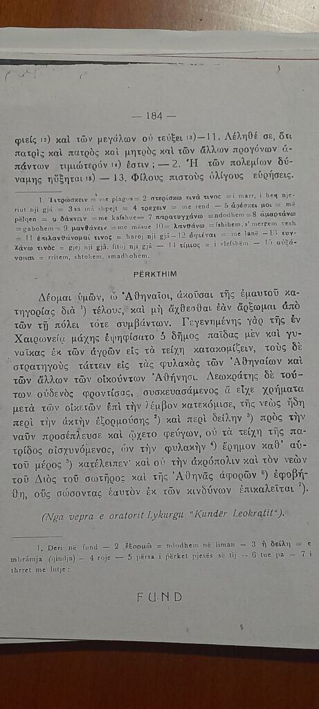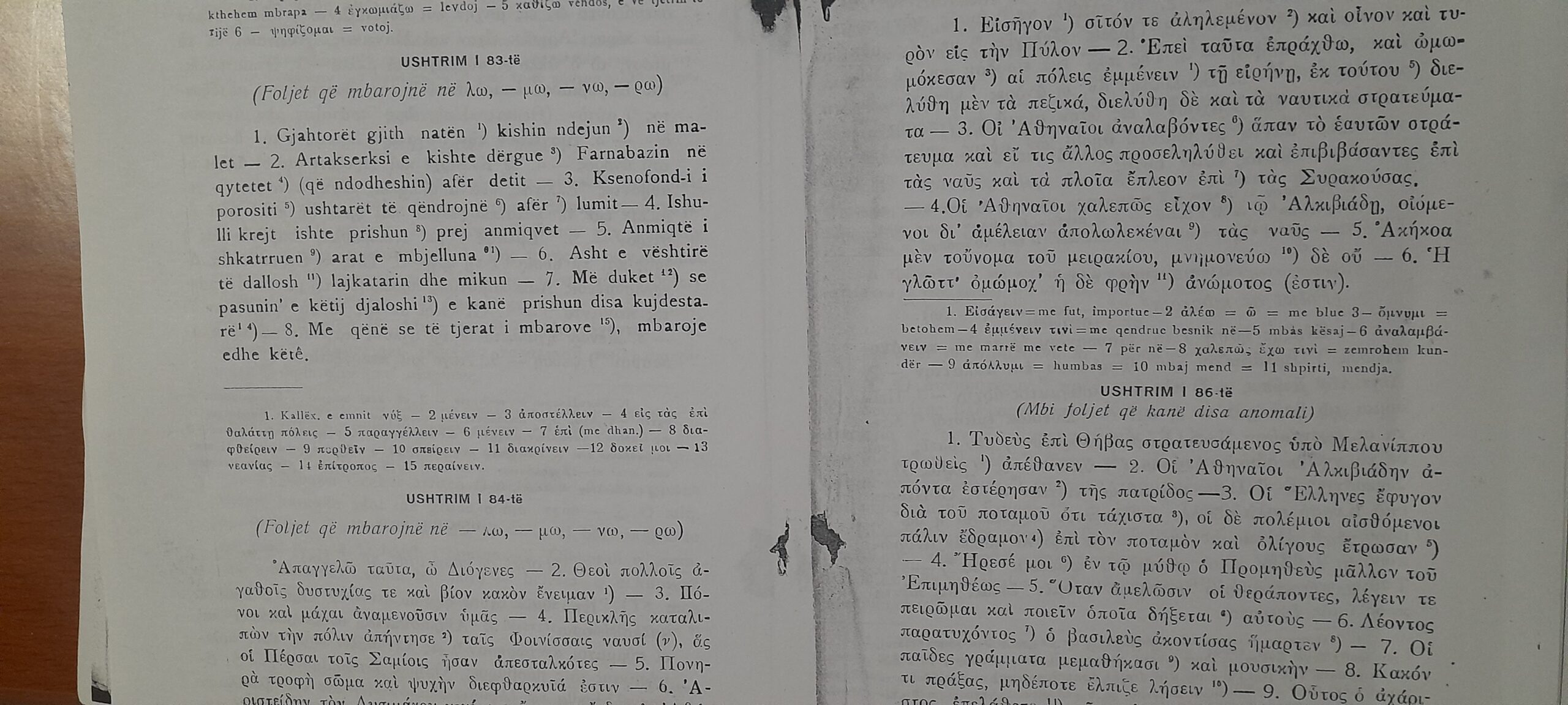 Καθώς η 9η Φεβρουαρίου – και για πρώτη φορά φέτος με την επικύρωση της UNESCO – τιμάται ως Παγκόσμια Ημέρα της Ελληνικής Γλώσσας, αξίζει μια αναφορά σε σχολικό εγχειρίδιο που εντοπίσαμε στην προπολεμική Αλβανία. Δεν είναι απ’ τα πλέον εξεζητημένα που αφορούν την διδασκαλία των ελληνικών σε άλλα μεγάλα έθνη, ή που φέρουν το κύρος σπουδαίων πανεπιστημιακών εδρών, ή ακαδημαϊκών επιστημόνων.