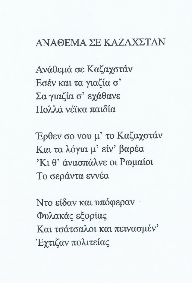 «Τα Ρωμαίικα τα χωρία / κλαίνε, μοιρολογούνε/ ακόμαν το τριάντα εφτά / ατά αναστορούνε./… Ση Σιβηρίας τα ορμάνια / εχάθαν τα παιδία ‘τουν / και ακόμαν κανείς ‘κ’ εξέρ’/ που έν τα ταφία ‘τουν»