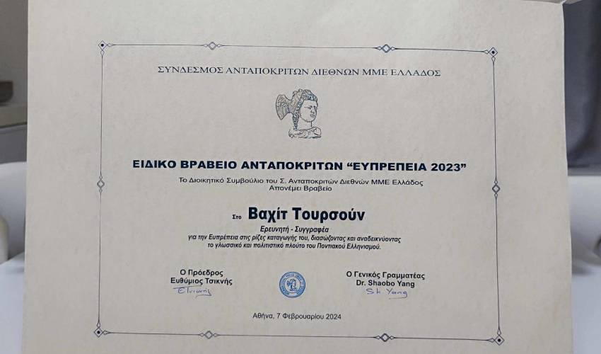 Την Τετάρτη 7 Φεβρουαρίου 2024 ο Vahit Tursun τιμήθηκε από τον Σύνδεσμο Ανταποκριτών Διεθνών ΜΜΕ Ελλάδος (International Press Union Of Greece) με το “Βραβείο Ευπρέπειας 23” για το λεξικό του με τίτλο “Romeika-Türkçe Sözlük. Trabzon Rumcası” (Ελληνο-τουρκικό λεξικό. Τα ρωμαίϊκα της Τραπεζούντας) που εκδόθηκε στην Κωνσταντινούπολη από τις εκδόσεις Eyamola του Omer Asan. Η διάλεκτος αυτή ομιλείται έως σήμερα στην περιοχή της Τραπεζούντας στην βορειοανατολική Τουρκία.
