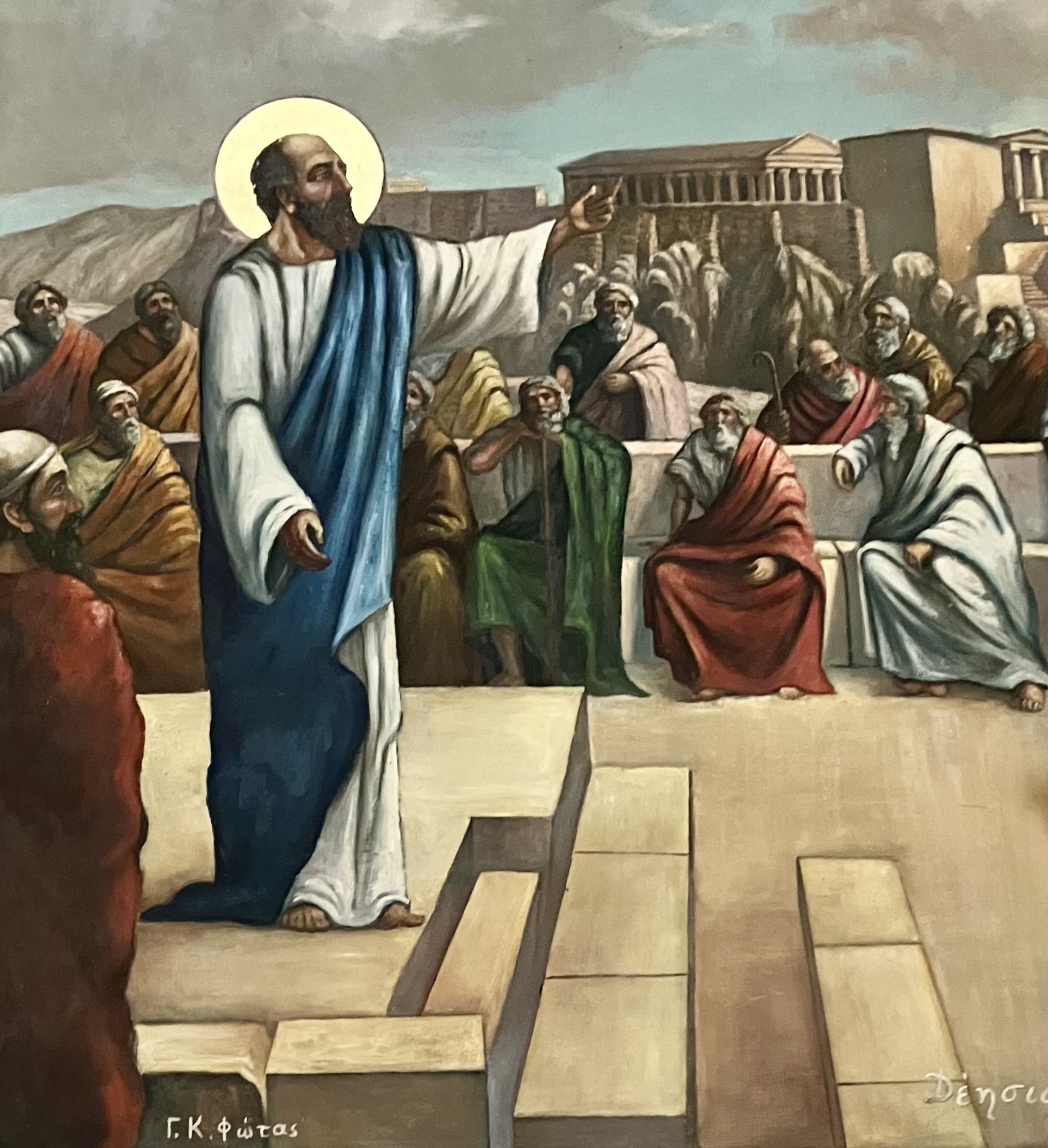 Στην αθηναϊκή συνοικία της Νεάπολης, σε τοίχο του ναού του Αγίου Νικολάου Πευκακίων – ο οποίος θεμελιώθηκε το 1889 από τον ταγματάρχη του Μηχανικού Σώματος, καθηγητή του Εθνικού Μετσόβιου Πολυτεχνείου Γεράσιμο Αναστ. Μεταξά (1816-1890) και με συνεχιστή των εργασιών τον γιο του Αναστάσιο (1862-1937) και εγκαινιάστηκε το 1895,―έχει φιλοτεχνηθεί σύνθεση που απεικονίζει το κήρυγμα του Αποστόλου Παύλου στον Άρειο Πάγο. Η τοιχογραφία φέρει την υπογραφή Γ. Κ. Φώτας και θα πρέπει να χρονολογηθεί στη δεκαετία του 1920.