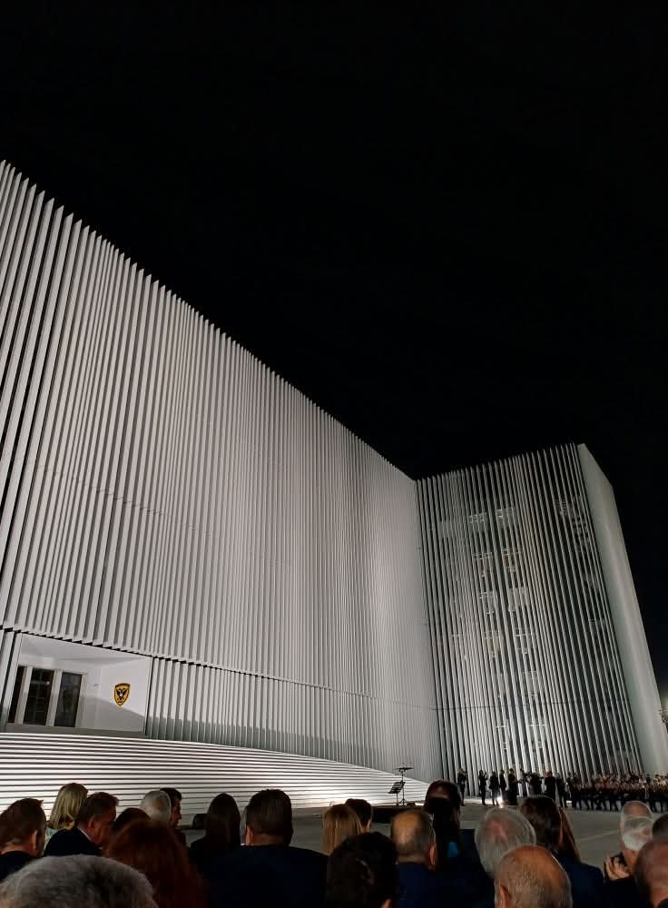 Εν αρχή ήταν η γλυπτική κατασκευή “Κιβωτός της Εθνικής Μνήμης”, δηλαδή τα ονόματα των 112.692 καταγεγραμμένων πεσόντων “εν τοις ιεροίς του έθνους ημών αγώσι. Πάλαι τε και επ’ εσχάτων”. Που φιλοτέχνησε ο γλύπτης Κώστας Βαρώτσος χαράσσοντας σ’ έναν λαβύρινθο γυάλινων “πύργων” πριν έξι μήνες τα ονόματα των σκοτωμένων για την πατρίδα αγωνιστών. Κι έπειτα η λαμπρά ανακαινισμένη πρόσοψη του ιστορικού κτηρίου του Υπουργείου Εθνικής Αμύνης και του ΓΕΕΘΑ με μια ευρηματική λύση περσίδων από αλουμίνιο σαν αύλακες κιόνων από τον ίδιο δημιουργό, την αρχιτέκτονα Χρυσάνθη Ασπρουλοπούλου και τους συνεργάτες τους που δημιουργούσαν ένα αρμονικό όσο και επιβλητικό σύνολο.