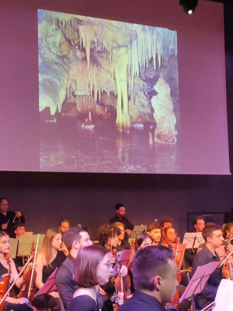 Η σύνθεση της εκδήλωσης με την πολυάνθρωπη ορχήστρα Νέων και τον βιολονίστα Θάνο Κουιμτζόγλου, στο “5ο κονσέρτο για βιολί και ορχήστρα” του Μότσαρτ, την προβολή σε γιγαντοοθόνη εσωτερικών αποτυπώσεων σπηλαίων με σταλακτίτες και σταλαγμίτες σε μοναδικές συνθέσεις γλυπτών που σμιλεύει η φύση, που εκατομμύρια χρόνια πριν ικανοποίησε το κοινό που απόλαυσε μια ξεχωριστή πολιτιστική βραδιά μέσα από μία παλέτα μοναδικών ηχοχρωμάτων με βιολιά, βιόλες, βιολοντσέλα, κρουστά, έγχορδα, πνευστά.