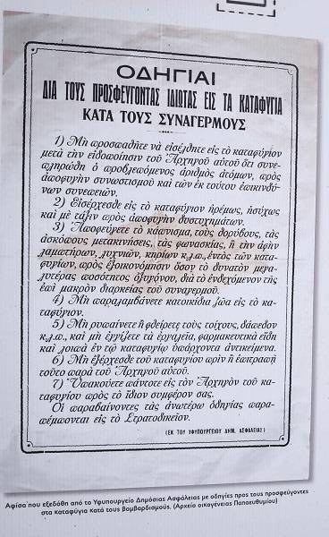 Σήμερα κινείται κανείς σε ένα χώρο που φτιάχτηκε με προδιαγραφές, που είχε συγκεκριμένες οδηγίες για να αποφεύγεται ο συνωστισμός, τα δυστυχήματα, να γίνεται εξοικονόμηση του οξυγόνου αν υπάρχει μακρά διάρκεια του συναγερμού, ενώ στο ειδικό έντυπο εποχής που εκτίθεται αναφέρεται πως «οι παραβαίνοντας τας ανωτέρω οδηγίας παραπέμπονται εις το Στρατοδικείον».