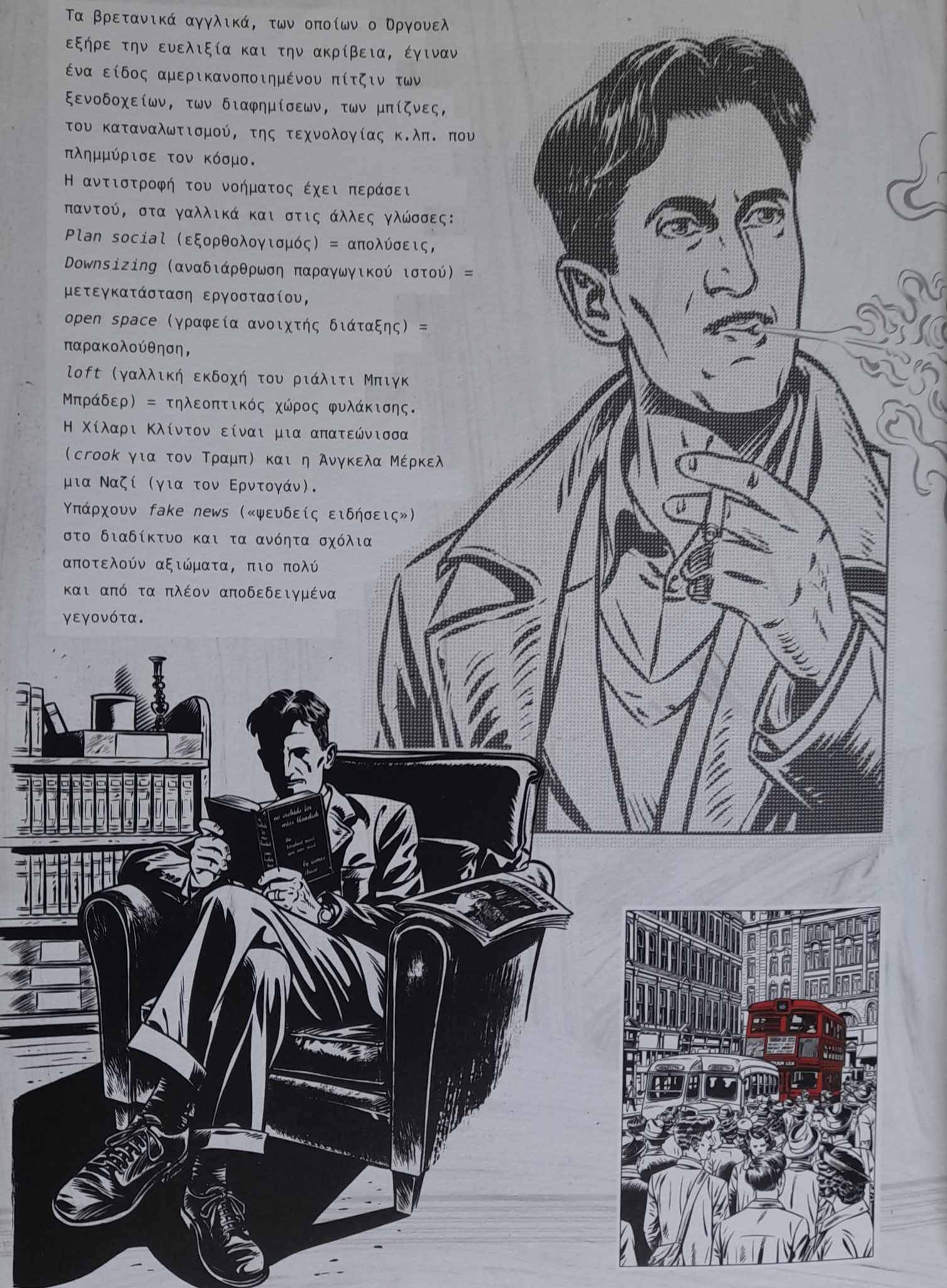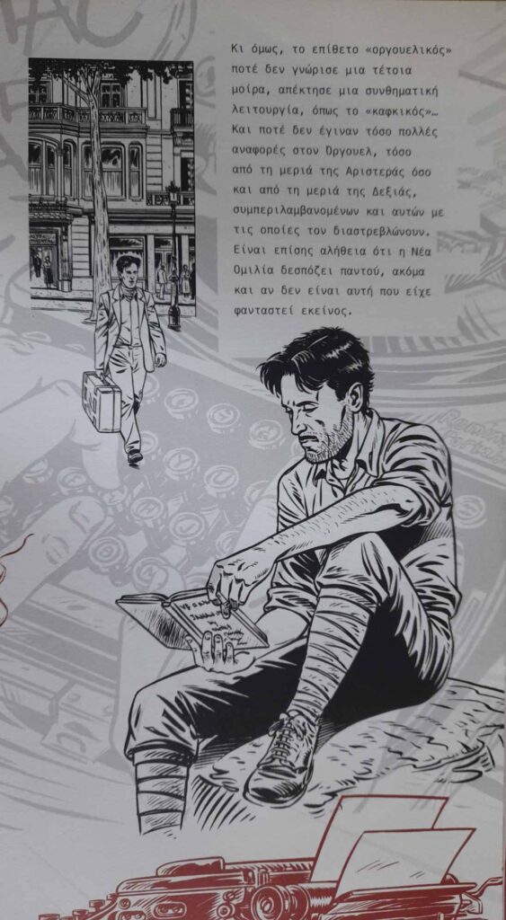Σκαλίσαμε τη ζωή του γιατί έπεσε στα χέρια μας μια πολύ καλή εκδοτική δουλειά, η βιογραφία του σε σκίτσα ή γκράφικ νόβελ (γραφιστικό μυθιστόρημα το λένε πολλοί γιατί θεωρούν ότι ο όρος κόμικς είναι υποτιμητικός), που κυκλοφορεί από τις εκδόσεις Μίνωας σε μετάφραση από τα γαλλικά. Στις 150 σελίδες του βιβλίου τόσο ο συγγραφέας όσο και οι εξαιρετικοί καλλιτέχνες που συνεργάστηκαν αποδίδουν τις πιο σημαντικές στιγμές στην παράδοξη ζωή αυτού του εμπνευσμένου συγγραφέα. Ενός ανθρώπου που προέβλεψε απίστευτες καταστάσεις και που όμως, όταν ολοκλήρωσε το “1984”, είπε με τον συνήθη αυτοοικτιρμό του, «μπα, αποκλείεται να πουλήσει».