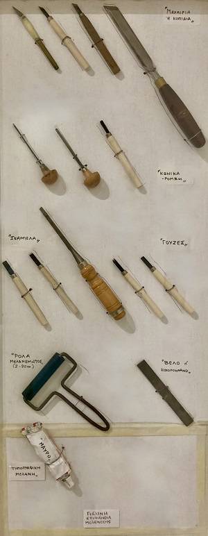 Ως προς τη χαρακτική επιδόθηκε στην αρχέγονη ξυλογραφία του πλάγιου ξύλου. Ευδιάκριτες θεματογραφικές κατηγορίες των χαρακτικών του είναι οι εξής οκτώ: 1. Αιγαιοπελαγίτικη Αρχιτεκτονική – Ταξιδιωτικά, 2. Ελληνικά Καφενεία – Καρέκλες, 3. Νεοκλασικά Κτήρια, 4. Βάρκες – Αιγαίο, 5. Δέντρα – Φυτά, 6. Ηλεκτρισμός, 7. Ανθρώπινες Μορφές – Φαντάσματα, 8. Μικροχαρακτική – Σελιδοδείκτες – Κτητορικά Βιβλιόσημα (Ex Libris). Συνηθίζει να λέει για τη χαρακτική ότι είναι η τζαζ των εικαστικών τεχνών, που απαιτεί γνώση σχεδίου, σύνθεσης, χρώματος και τεχνικής.