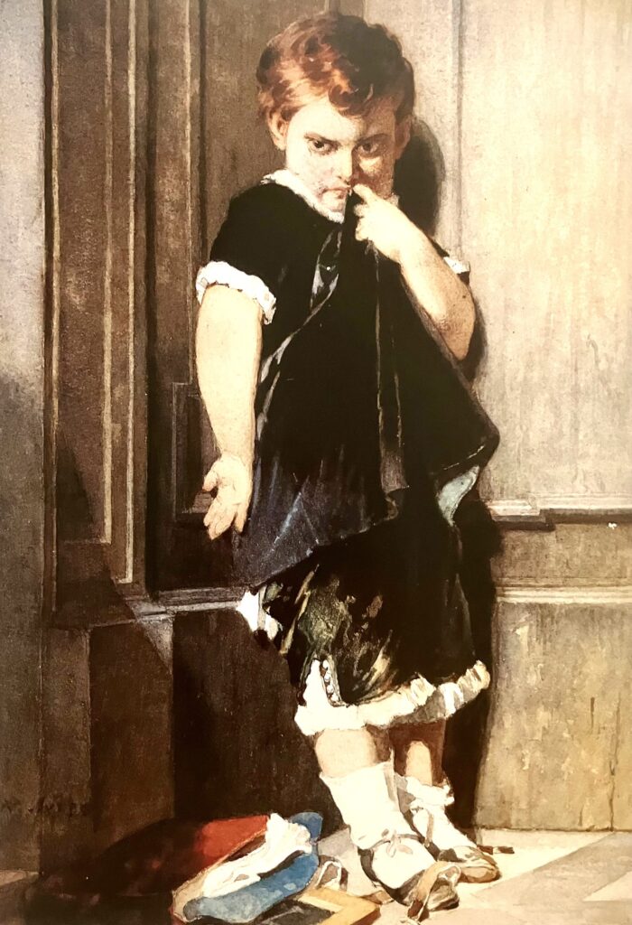Ο Νικηφόρος Λύτρας υπήρξε δικαίως επιφανής ζωγράφος στους κύκλους της υψηλής αθηναϊκής κοινωνίας. Έχει φιλοτεχνήσει προσωπογραφίες μελών της αλλά και εικόνες παιδιών. Στο συγκεκριμένο έργο του αποδίδει γραφικές λεπτομέρειες του θέματός του, όπως το θυμωμένο βλέμμα του παιδιού που κοιτάζει μπροστά προς τα δεξιά και τα σφιγμένα χείλη του, το τσαλακωμένο βιβλίο του που μισοβγαίνει από τη σάκα και τη μαύρη πλάκα του για την κιμωλία, το σκέρτσο του στραμμένου πίσω δεξιού χεριού του που αποτυπώνει την απόλυτη άρνησή του, τα στυλωμένα πόδια του.
