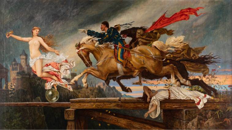 Ο νεαρός άνδρας με την κομψή ενδυμασία καλπάζει στο άλογό του πάνω από γέφυρα αβυσσαλέου χάσματος για να πιάσει την θεά Τύχη (Fortuna), ενώ στο βάθος απλώνεται βορειογερμανικό τοπίο. Πίσω από τον άνδρα η ξαπλωμένη, ξεψυχισμένη νεαρή γυναίκα δεν πρόλαβε να τον σταματήσει, ενώ πίσω του τρέχει να τον προφτάσει ο Διάβολος-Θάνατος…