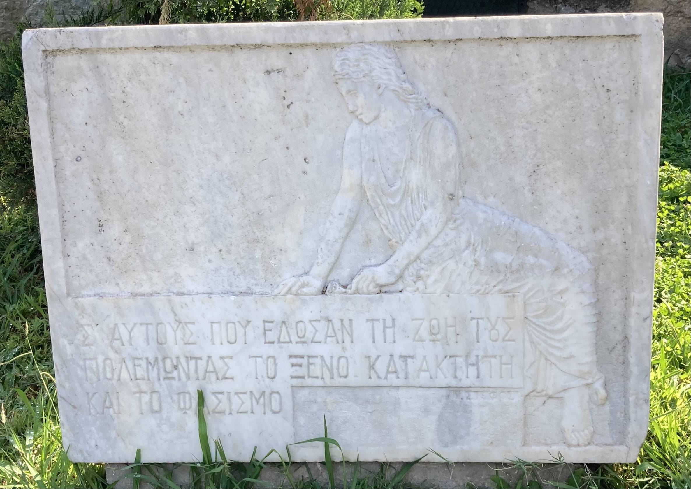 Ενδιαφέρον παρουσιάζει η προσθήκη στον χώρο του μνημείου ανάγλυφης πλάκας με παράσταση προσωποποίησης της αρχαιοπρεπούς Ελλάδος που αποθέτει ένα τριαντάφυλλο σε αυτούς που έδωσαν τη ζωή τους πολεμώντας τον ξένο κατακτητή και τον φασισμό, έργο του γλύπτη Νίκου Στέφου, γεννημένου στη Δεσφίνα το 1944, πέντε μέρες μετά από τη φυγή των Γερμανών. Η συνύπαρξη των δύο μνημείων δεν προκαλεί, όπως άλλες ατυχείς περιπτώσεις ηρωικών μνημείων ανά την Ελλάδα.