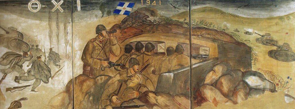 Η τολμηρή νωπογραφία, διαστάσεων 1,07×10,50 μ., αποτοιχίστηκε και φυλασσόταν το 1980 στην αποθήκη της Δ’ Εφορείας Νεωτέρων Μνημείων Θεσσαλονίκης. Θέμα της, όπως το γνωρίζουμε από τη μακέτα της, ήταν ζωφόρος με το συνεχές των αγώνων της ελληνικής φυλής: από τον Αλέξανδρο και το Βυζάντιο, έως το 1821, το 1912-13 και το 1940-41. Η τελευταία σύνθεση απεικονίζει την απόκρουση των Ιταλών και μακρύτερα τα γερμανικά τανκς (Panzer) να προχωρούν προς τη Γραμμή Μεταξά.