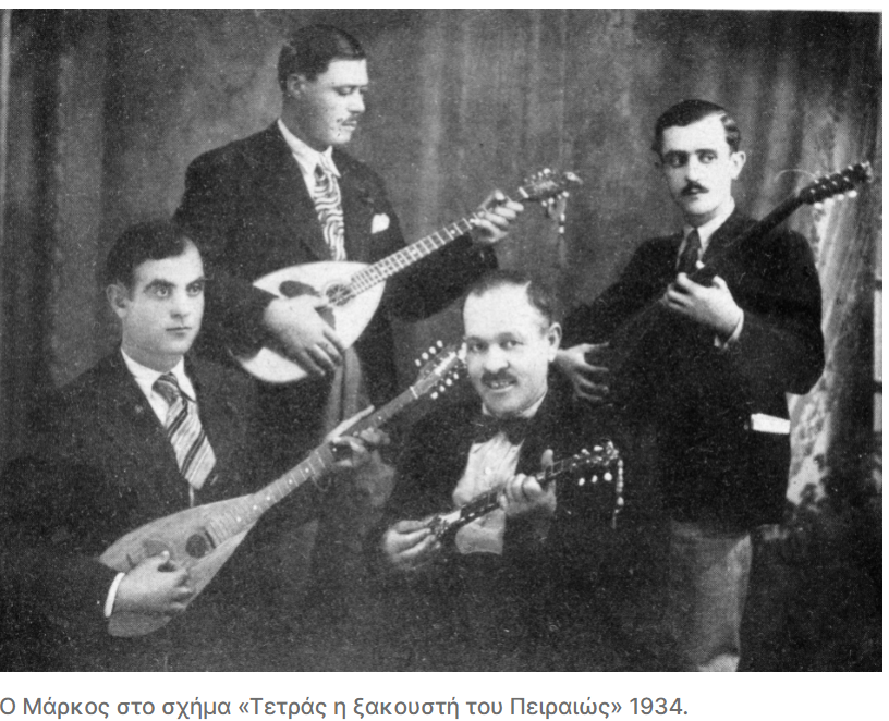 Ο Μάρκος δημιούργησε το συγκρότημα “Τετράς η ξακουστή του Πειραιώς”, την πρώτη-πρώτη ρεμπέτικη κομπανία, το καλοκαίρι του 1934 και η δημιουργία της ήταν τότε μία επανάσταση στη διασκέδαση των λαϊκών (κυρίως) ανθρώπων. Έκανε απλές περιοδείες, μ’ ένα-δυο άτομα, σε όλη την Ελλάδα, σχεδόν για ένα κομμάτι ψωμί, για να το στέλνει στην οικογένειά του!
