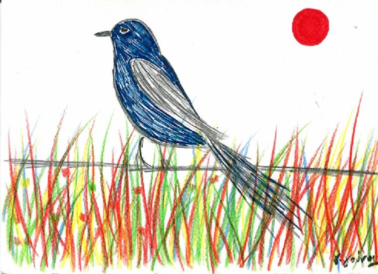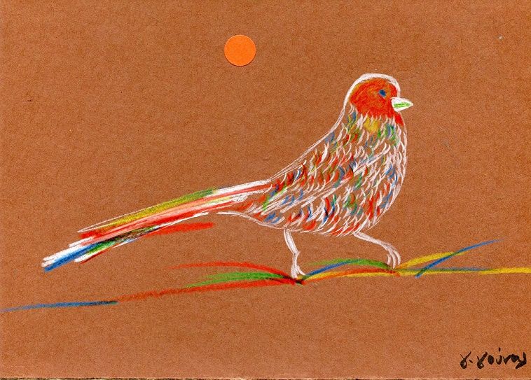 Χρωματιστά μολύβια, μελάνια, μαρκαδόροι… Υλικά της παιδικής μου ηλικίας. Σε αυτά ξαναγύρισα… Αυτά χρησιμοποίησα σε αυτή την δουλειά. Επίσης, σε κάποια έργα δούλεψα και με την τεχνική του κολάζ. Γιατί πουλιά; Είχα την ανάγκη να ξαναγυρίσω στον απολεσθέντα παράδεισο των παιδικών μου χρόνων. Ήθελα να ξαναζωντανέψω όλα αυτά τα αθώα πλάσματα με τα δικά μου χρώματα και τους δικούς μου ουρανούς. Συναρμολόγησα μνήμες, εικόνες, χαρές, λύπες και δημιούργησα 50 πουλάκια που το καθένα κρύβει με τα φτερά του και μια μικρή ιστορία».