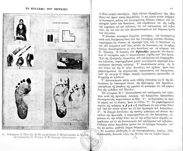 Φερειπείν, στην εικόνα 21 παρακάτω, στο βιβλίο του “Εισαγωγή εις την εγκληματολογικήν ανθρωπολογίαν” (1910), ο Μιχαήλ Αθανασιάδης αναφέρεται στο έργο του Μπερτιγιόν, μιλά για τη δαχτυλοσκοπία και τον εισηγητή της, Φράνσις Γκάλτον. Τονίζει τη σημασία της πρακτικής εφαρμογής της θεωρίας και παρουσιάζει περιπτώσεις που είχε ο ίδιος αναλάβει ως διευθυντής του ανθρωπομετρικού τμήματος, μαζί με φωτογραφίες από τους τόπους εγκλημάτων, ίχνη από την “πελματοσκοπία” και “παλαμοσκοπία” κι άλλα τεκμήρια.
