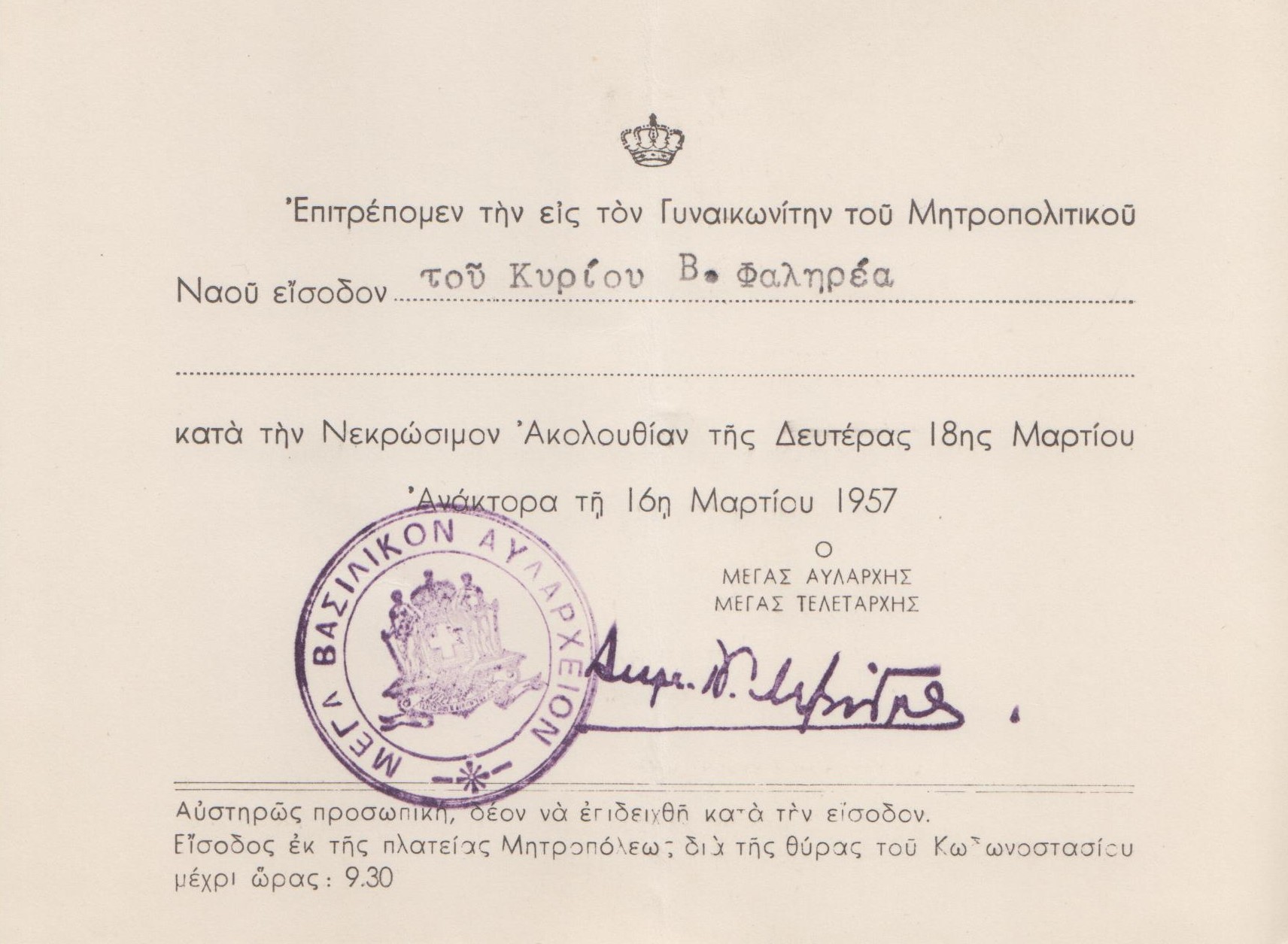 Ο Φαληρέας δεν έκρυβε το ότι η σχέση του με το παλάτι στάθηκε πολύ στενή. Αρκετά από τα πρόσωπα της βασιλικής οικογένειας είχαν ποζάρει για τις προτομές ή για τα μετάλλιά τους. Έτσι, το 1957 είναι επίσημος προσκεκλημένος των Ανακτόρων στην εξόδιο τελετή της συζύγου του γιου του βασιλιά Γεώργιου Α΄ και της βασίλισσας Όλγας, πρίγκιπα Νικόλαου της Ελλάδος, Μεγάλης Δούκισσας Ελένης Βλαδιμήροβνας της Ρωσίας, την προτομή της οποίας, σε χαλκοκασσίτερο, την ολοκλήρωσε το 1958.