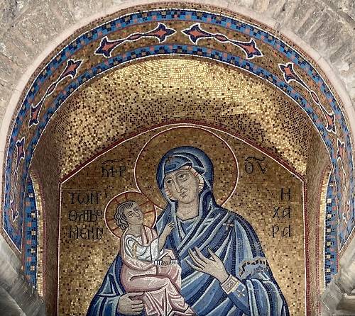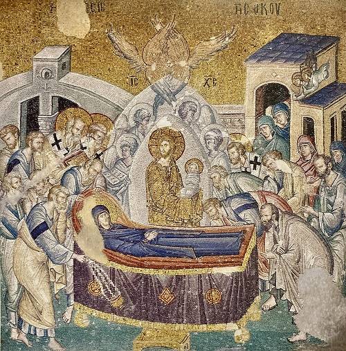 Χαρακτηριστικό παράδειγμα, η νηφάλιων συναισθημάτων παράσταση της Κοιμήσεως της Θεοτόκου, χρονολογημένη το 1315-20, στον δυτικό τοίχο της κωνσταντινουπολίτικης Μονής της Χώρας, την οποία το καθεστώς Ερντογάν μετέτρεψε σε τζαμί. Το ψηφιδωτό αποδίδεται σε υψηλής στάθμης συνεργείο, το οποίο είχε φτάσει σε θαυμαστό ύψος δεξιοτεχνικής εκτέλεσης. Ψηφιδωτές συνθέσεις με την Παναγία συναντάμε βεβαίως και στα νεότερα χρόνια.