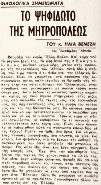 Το απόσπασμα προέρχεται από επιφυλλίδα του Βενέζη στην εφημερίδα “Το Βήμα”, στις 26 Μαρτίου 1957, η οποία αναδημοσιεύεται στον δεύτερο τόμο της έκδοσης κειμένων του με τίτλο “Ελληνική Διάρκεια. Μορφές και θέματα των γραμμάτων και των τεχνών”, με τη φιλολογική επιμέλεια του ομότιμου καθηγητή στο Αριστοτέλειο Πανεπιστήμιο Θεσσαλονίκης, Χ. Λ. Καράογλου (Βιβλιοπωλείον της “Εστίας” Ι. Δ. Κολλάρου και Σίας Α.Ε., Αθήνα 2021).