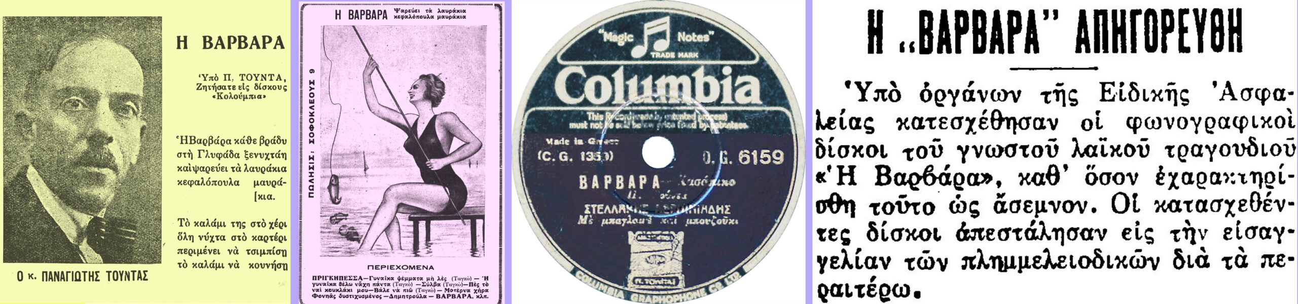 Το 1936 γράφτηκε η θρυλική και ιστορική “Βαρβάρα” επισήμως από τον Παναγιώτη Τούντα. Απαγορεύτηκε όμως από τον Μεταξά, γιατί όλοι κατάλαβαν ότι το τραγούδι ήταν γραμμένο για στενό συγγενικό του πρόσωπο, σεξώλης και προώλης! Αμέσως, όμως, κυκλοφόρησε άλλο τραγούδι με την ίδια μουσική και το ίδιο νόημα, αλλά με τίτλο “Η Μαρίκα η δασκάλα”, με τα “σπίτια” τα μεγάλα!