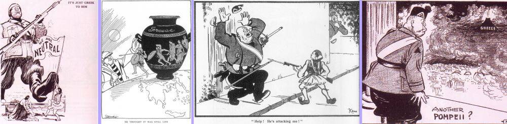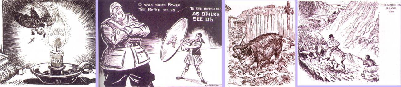 Με την έναρξη του ελληνοϊταλικού πολέμου από την φασιστική Ιταλία του “Ντούτσε”, εκτός από τα συνήθη όπλα, οι Έλληνες αμύνθηκαν ενάντια στον θρασύτατο εισβολέα και με ένα όπλο που έχουν κληρονομήσει από τον παππού μας τον Αριστοφάνη. Και εννοώ τη σάτιρα. Από τη σάτιρα δεν γλίτωσε κανένας τους…