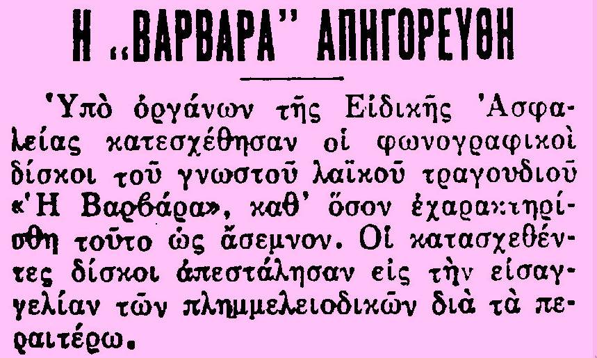 Απαγορεύτηκε κι αυτό, οπότε έγινε πεισματικά νέα έκδοση με την ίδια μελωδία και τίτλο “Μανωλιός και Δημητρούλα” (που πηγαίναν στη Γλυφάδα για “κούι-κούι”, όπως κι η Βαρβάρα). Φυσικά απαγορεύτηκε κι αυτό από το Μεταξά. Έτσι μ’ αυτό και μ’ εκείνο, φτάσαμε στον πόλεμο του ’40, οπότε κυκλοφόρησε η τέταρτη έκδοση της μουσικής της “Βαρβάρας”, με επίκαιρο όμως για την περίσταση περιεχόμενο και με τίτλο “Άκου Ντούτσε μου τα νέα”.