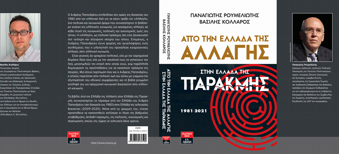 Την ερχόμενη εβδομάδα θα κυκλοφορήσει από τις εκδόσεις Α.Α. Λιβάνη το βιβλίο των Παναγιώτη Ρουμελιώτη, Ομότιμου καθηγητή του Παντείου Πανεπιστημίου και Βασίλη Κολλάρου, Δρ. Ιστορίας, με τίτλο “Από την Ελλάδα της Αλλαγής στην Ελλάδα της Παρακμής”. Η επιλογή του τίτλου του βιβλίου, αντικατοπτρίζει το πέρασμα από την Ελλάδα του Ανδρέα Παπανδρέου (τη δεκαετία του 1980) στην Ελλάδα της τελευταίας δεκαετίας (2009-2020). Μέσα από τις γραμμές του βιβλίου, γίνεται προσπάθεια να κατανοηθούν καλύτερα οι λόγοι της βαθμιαίας υποβάθμισης, δηλαδή της παρακμής της πολιτικής, οικονομικής και στρατιωτικής ισχύος της χώρας τα τελευταία δέκα χρόνια.