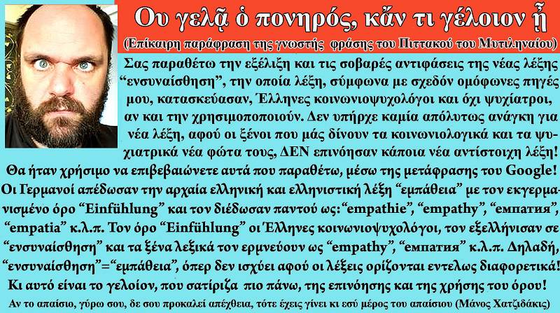 Σχετικά πρόσφατα, κάποια ημέτερα πονηρόπουλα ξεφτέρια, επινόησαν (χωρίς γνώση και κρίση) τη λέξη “ενσυναίσθηση”, μάλιστα, ως φαίνεται, χωρίς τη συνδρομή-γνώμη γλωσσολόγων (και κυρίως) ιστορικών! Δήλωσαν ότι είναι εξελληνισμένα, ο γερμανικός όρος “Einfühlung”. Και έτσι αρχίζει η μεγάλη αντίφαση!