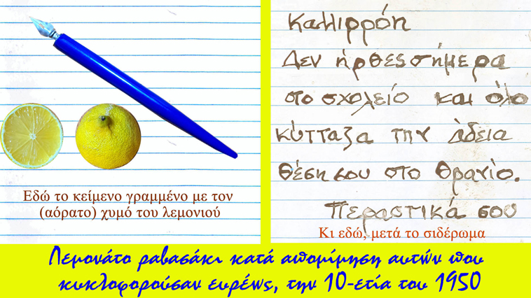Έτσι λοιπόν, όπως ανακαλύφθηκε ο νόμος της …βαρύτητας, έτσι ανακαλύφθηκαν τα λεμονάτα ραβασάκια. Δηλαδή, το κείμενο δε γραφόταν με το συνηθισμένο τότε μελάνι, αλλά με χυμό λεμονιού! Μάλιστα, χυμό λεμονιού, ο οποίος δε διακρινόταν στο χαρτί. Και για να διαβάσει η παραλήπτρια τι έγραφε, έπρεπε να σιδερώσει το χαρτάκι με καυτό σίδερο, ώστε να καεί το λεμόνι, να γίνει καφέ και έτσι το κείμενο να διαβάζεται. Φυσικά, έκανα για χάρη σας το πείραμα και σας δείχνω αμέσως το αποτέλεσμα… Παρ’ όλο που το λεμόνι είναι ξινό, τα λόγια της αγάπης που μετέφερε κρυφά, ήταν μέλι…