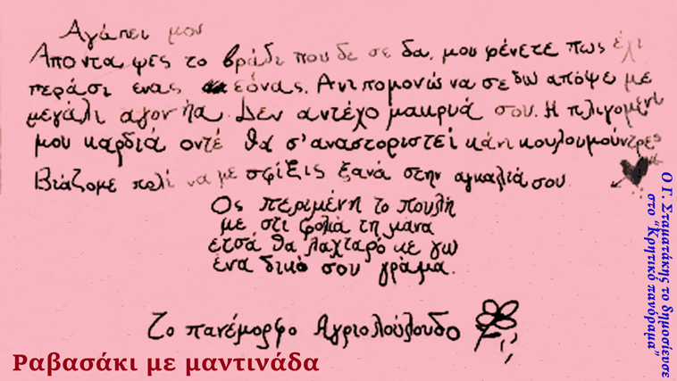 Τα ραβασάκια, τότε, αν δεν ήταν της εφορίας, ήταν ερωτικά! Τα περισσότερα ήταν σύντομα, δηλαδή λακωνικά και με περιεχόμενο “βαρύ”, ώστε το μήνυμα να δημιουργεί λαχτάρα… Π.χ. «Σήμερα στις 5, στο γνωστό δέντρο», «Αύριο μπορώ στις τρεις, για σινεμά», «Σε ονειρεύτηκα», «Μονάχα εσένα σκέφτομαι, …σκατό», «Είσαι για μισάωρη βόλτα απ’ το χεράκι, στην 5Ε;»…, τέτοια! Τα ραβασάκια, δεν είχαν καμία απολύτως σχέση με τις ηλίθιες “ερωτικές επιστολές”, συχνά πολυσέλιδες.