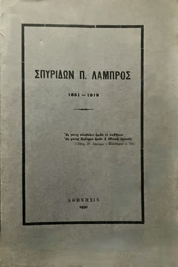 Τον Μάρτιο του 1917 ο Σπυρίδων Π. Λάμπρος (1851-1919) έβγαλε το πρώτο τεύχος του δέκατου τέταρτου τόμου του περιοδικού “Νέος Ελληνομνήμων”, που το εξέδιδε από το 1904. Έμελλε να είναι το τελευταίο τεύχος του… Τον Φεβρουάριο του 1920 η σύζυγός του Άννα (1861-1933) προχώρησε στην έκδοση τριπλού συμπληρωματικού τεύχους του περιοδικού, με ένθετη πένθιμη κάρτα της, στην οποία διαβάζουμε τη φράση «Προσφέρεται εις ευλαβή ανάμνησιν».