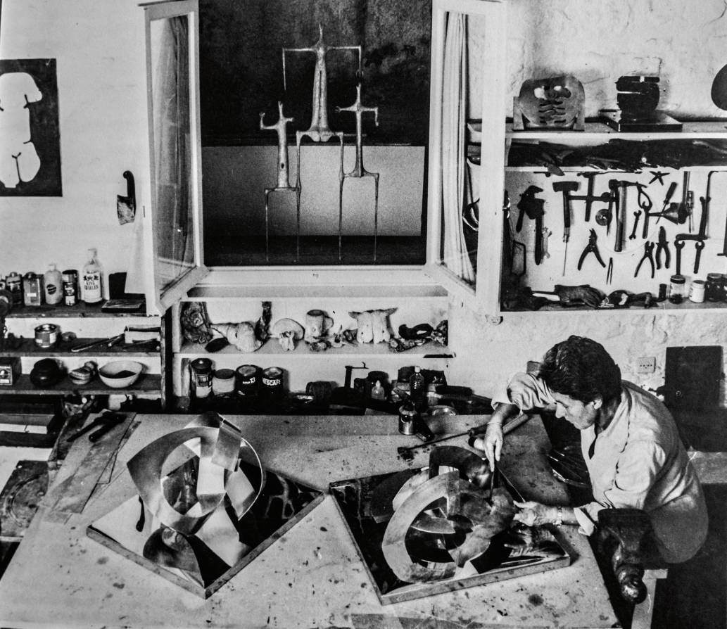 Στην έκθεση παρουσιάζονται εργαλεία, έργα και εικόνες των Θωμά Θωμόπουλου (1873/5-1937), Κώστα Δημητριάδη (1879-1943), Μιχάλη Τόμπρου (1889-1974), Θανάση Απάρτη (1899-1972), Μπέλλας Ραφτοπούλου (1902-1992), Γιώργου Ζογγολόπουλου (1902/3-2004), Κλέαρχου Λουκόπουλου (1906-1995), Αχιλλέα Απέργη (1909-1986), Χρήστου Καπράλου (1909-1993), Φρόσως Ευθυμιάδη-Μενεγάκη (1911-1995), Λάζαρου Λαμέρα (1911-1998), Κώστα Κουλεντιανού (1918-1995), Άλεξ Μυλωνά, Κώστα Κλουβάτου (1921-2007), Ναυσικάς Πάστρα (1921-2011), Σωσώς Χουτοπούλου-Κονταράτου (1923-1984), Φιλόλαου (Τλούπα, 1923-2010), Ναταλίας Μελά (1923-2019), Βάσου Καπάνταη (1924-1990), Takis (Παναγιώτη Βασιλάκη, 1925-2019), Γαβριέλλας Σίμωσι (1926-1999) και Γεράσιμου Σκλάβου (1927-1967).