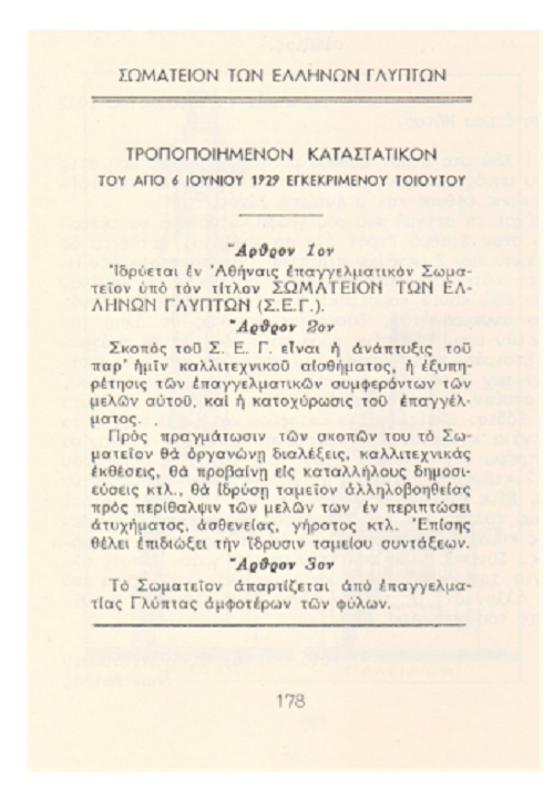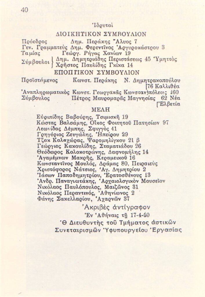 Στις 31 Μαρτίου 1938, στην 58η Γενική Συνέλευση των μελών του Σωματείου, ψηφίζεται το τροποποιημένο καταστατικό του, που εγκρίνεται στην 59η Γενική Συνέλευση της 10ης Νοεμβρίου 1938, με πρόεδρο τον Χριστόφορο Νάτσιο (1903-1977) και με γενικό γραμματέα τον Δημήτριο (Μήτσο) Περάκη (1893-1965).