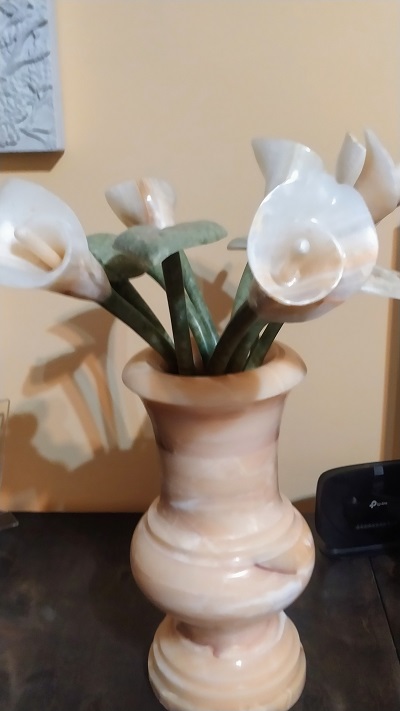Μέσα στο σπίτι του τα πάντα είναι δικές του κατασκευές και δημιουργίες. Τα ξύλινα παράθυρα, τα έπιπλα κουζίνας, σαλονιού, οι εντυπωσιακοί πίνακες ζωγραφικής, διακοσμητικά μπουκάλια σμιλεμένα με εξαιρετικά σχέδια, μαρτυρούν την αγάπη του και για το γυαλί, μεγάλα έργα αλλά και μινιατούρες για δώρα. Ένα μπουκέτο λουλούδια από όνυχα τόσο φυσικά κλέβει την ματιά μας στο αλαβάστρινο βάζο δικής του κατασκευής. Τριαντάφυλλα, κρίνα κ.α. άνθη από πέτρα ή λαμαρίνα.