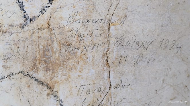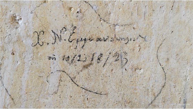 Βρήκαμε και πολλές κατοπινές επιγραφές τουρκικών ονομάτων, που ήθελαν να βεβηλώσουν τον χώρο. Ενώ είχαμε απογοητευτεί από την άκαρπη προσπάθεια, ο Μανώλης, ανεβαίνοντας θαρραλέα την σκάλα προς τον γυναικωνίτη, στην κυρτή οροφή του κλιμακοστασίου βρήκε 2-3 υπογραφές στον τοίχο, μαζί και του παππού μου. Ρόγος συγκίνησης, αλλόκοτο μήνυμα από το υπερπέραν! Με καλλιγραφικά γράμματα έγραφε «Χρήστος Ν. Εμμανουηλίδης» και από κάτω 10/23/8/23. Η ημερομηνία είναι αμέσως μετά την συμφωνία της Λωζάνης που θα εξανάγκαζε αυτόν, νιόπαντρο δάσκαλο του χωριού, την οικογένειά του και τους συμπατριώτες τους να εκπατριστούν.