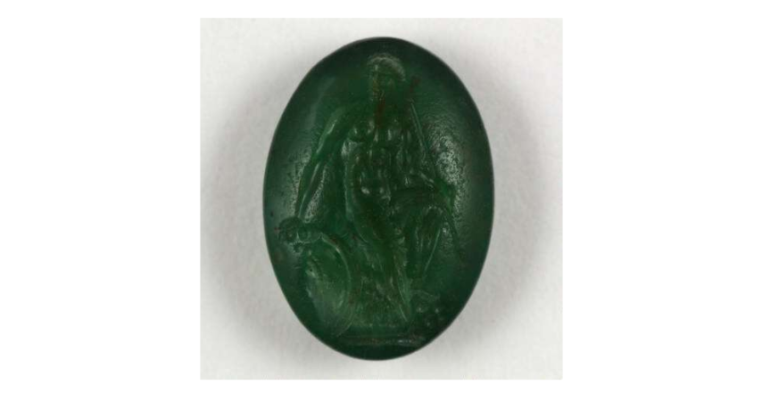 Ελληνιστική βαθυτυπία, ύψους μόλις ενός εκατοστού, όπου έχει χαραχτεί ένας πολεμιστής με λόγχη και ασπίδα, ο οποίος ακουμπά σε βράχο. Χρονολογείται χονδρικά στο 323π.Χ.-31π.Χ. Αγοράσθηκε από τον Αθηναίο συλλέκτη νομισμάτων Σ. Σεφεριάδη το 1928. Μοιάζει με το κλαπέν. Δεν αναφέρεται το πού βρέθηκε.