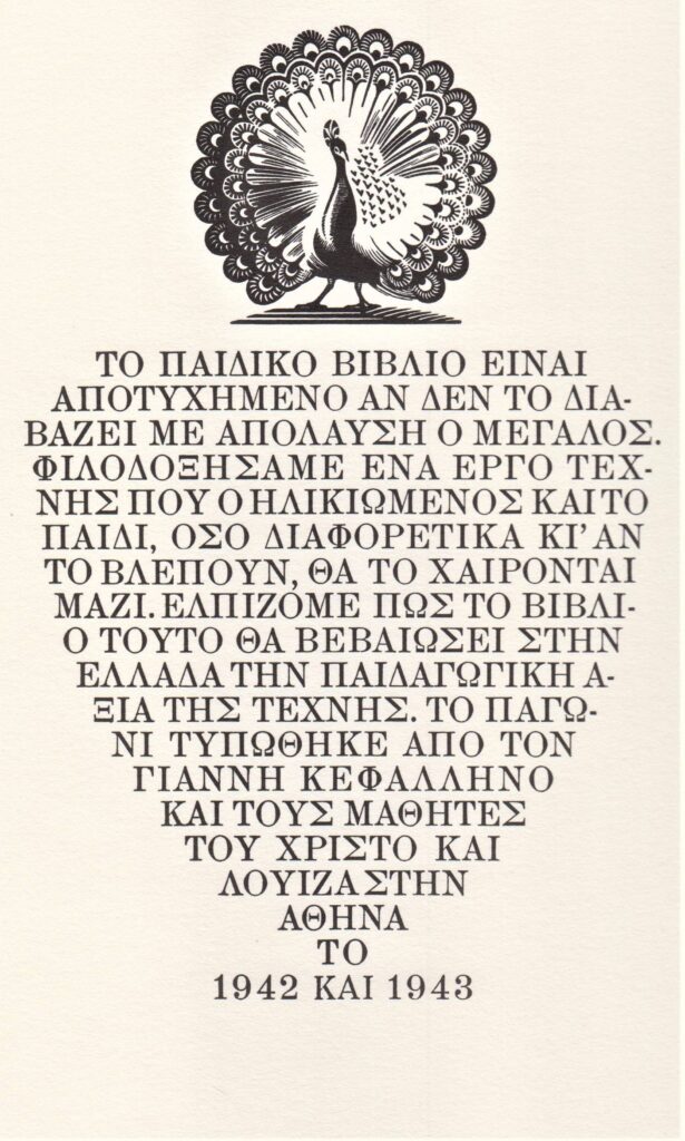 Τέτοιο είναι το λεύκωμα “Το Παγώνι”, που τυπώθηκε στην Αθήνα το 1942 και το 1943 σε δύο μεγέθη: το ένα σε μεγάλο σχήμα (41,5×33 εκ.) και σε ειδικό χαρτί, σε 150 αριθμημένα αντίτυπα και το άλλο σε μικρότερο σχήμα (30×24,5 εκ.) για παιδιά. Σκοπός ήταν να το χαρούν μαζί μεγάλοι και μικροί, βεβαιώνοντας στην Ελλάδα την παιδαγωγική αξία της Τέχνης.